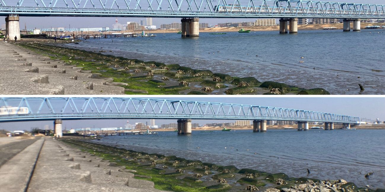 上がノーマルレンズ。下が広角レンズで撮影した写真です。上下は切れていますが広角レンズを使うと、川の向こう岸まで橋が移っているのがわかりますね。