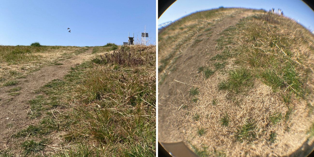 左がノーマルレンズで丘の下から撮影した写真。右が魚眼レンズで撮影した写真です。地球儀のようなまん丸写真が撮れました。