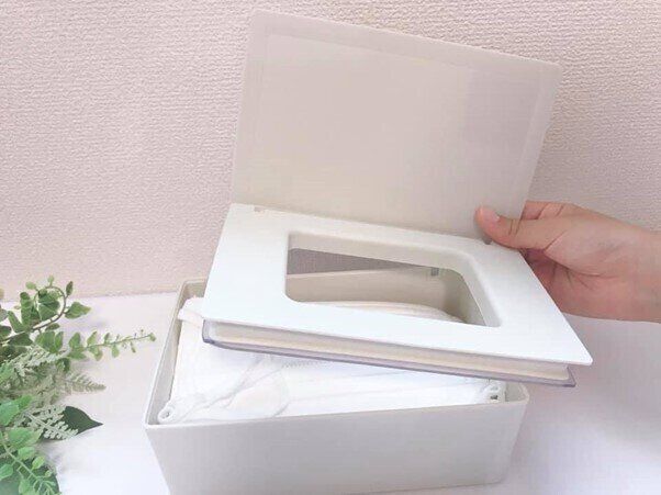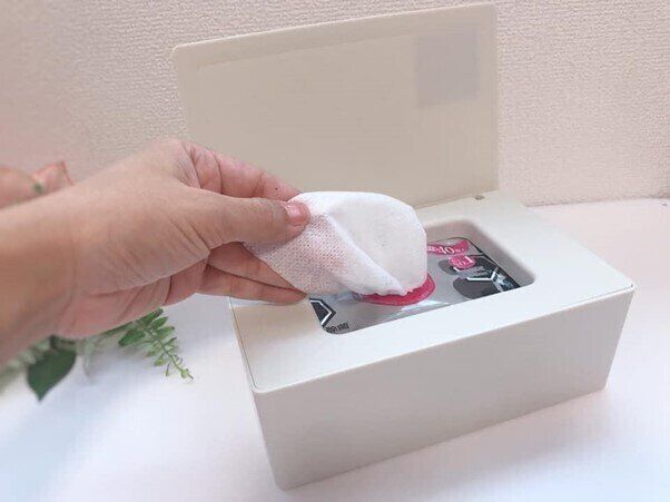ウエットティッシュや除菌シートもピッタリ入ります。ふたの縁にはパッキンが付いているので密閉効果があり、ウエットティッシュなどの乾燥を防いでくれるし、取り出す時にふたも一緒にパカっと外れることもありません。