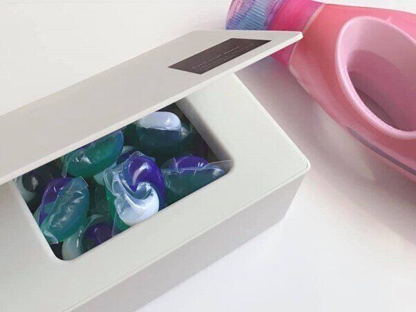 キューブ型洗剤や食洗器の洗剤入れとしても便利です。間口が広く、ボックスの隅まで手が届くので、最後の1個でも取り出しやすいです。