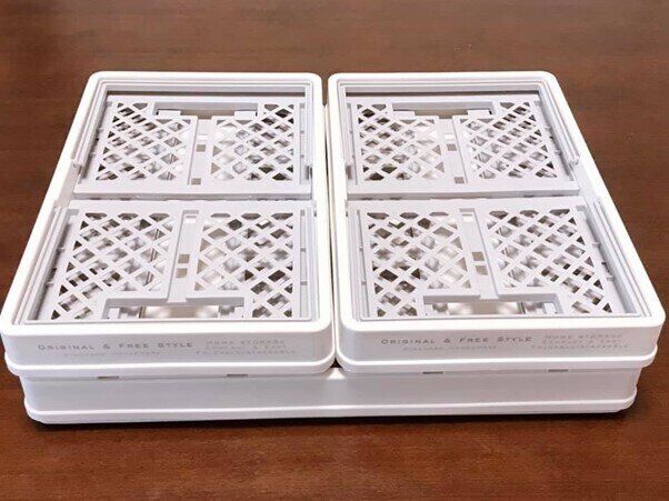 折り畳み時も、組み立て後もスタッキングができるのがうれしいポイント。同サイズは勿論、Mサイズの上にSサイズを2つ並べてもぴったりスタッキングできるので、見た目もすっきり!