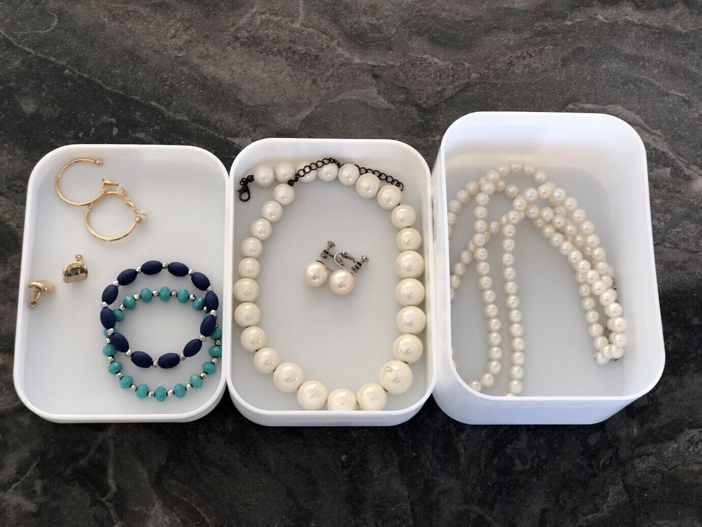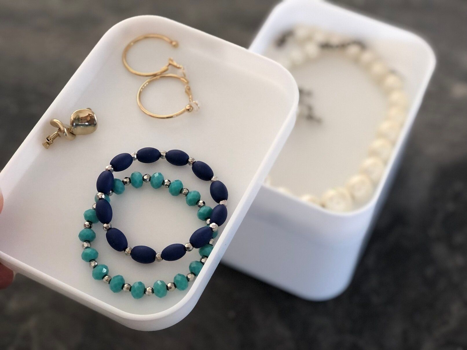 Mシリーズの3サイズをセット使いして、立派なアクセサリーの3段収納が完成!メイク道具とセットで置いておきたくなりますね。