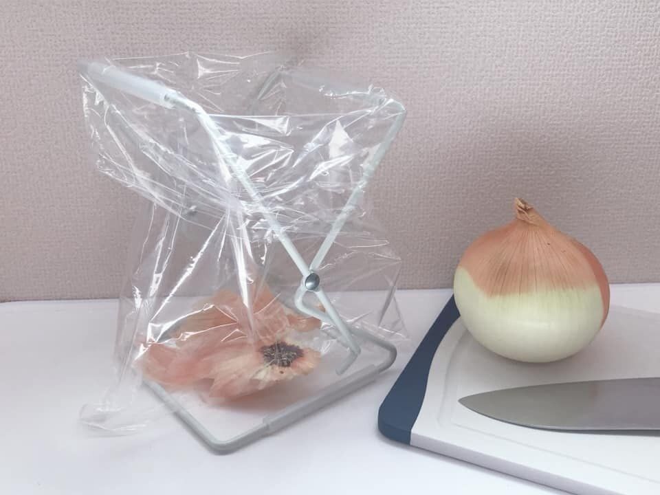 まずはふつうにダストホルダーとして活用する方法を紹介。ダストホルダーにビニール袋をセットしたら、ゴミ入れの完成です。コンパクトなので、キッチンの調理台に置いても邪魔になりにくく、シンクでは三角コーナー代わりとしても使えます。