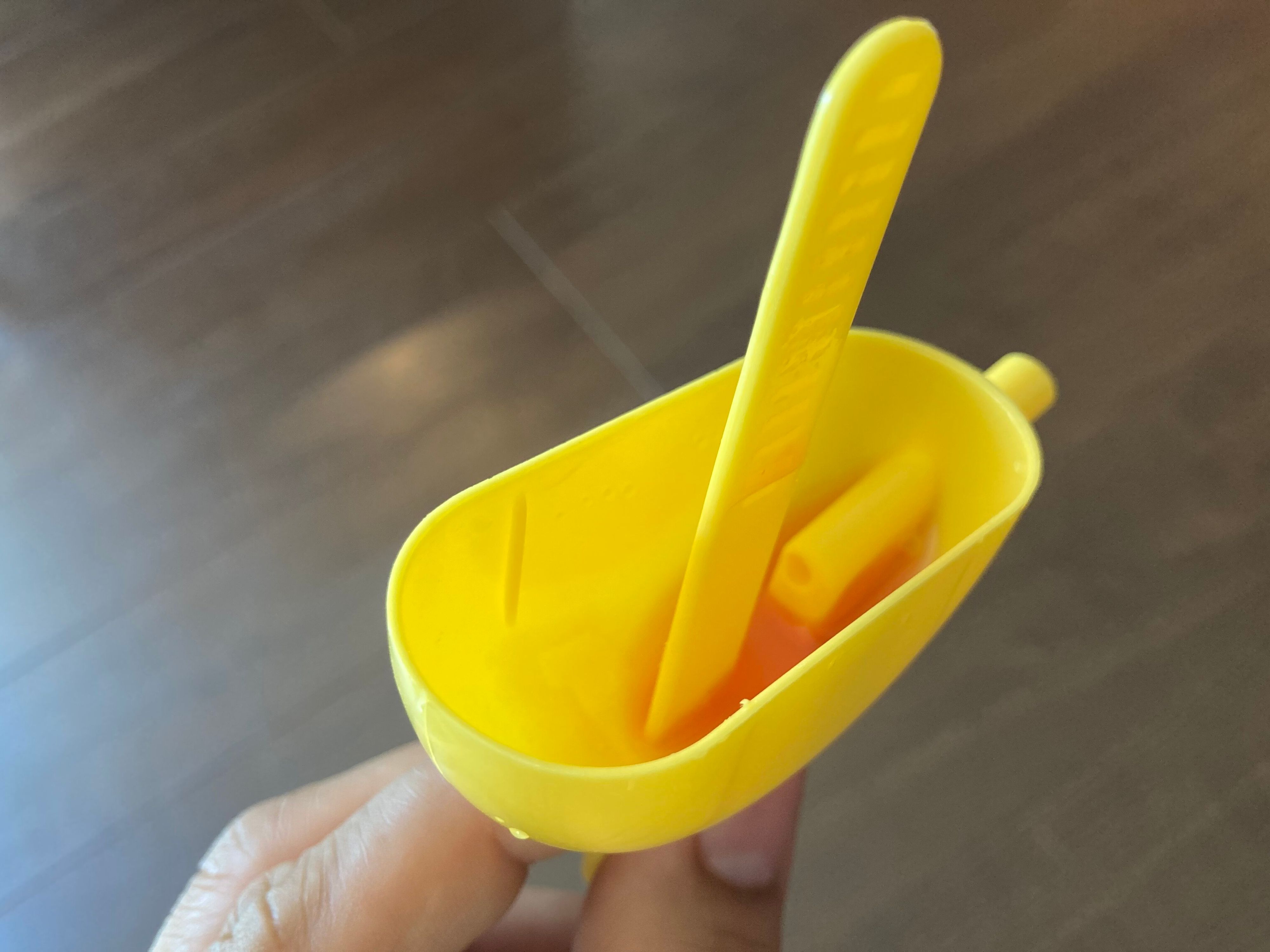 ストローは使いこなせませんでしたが、バーの下に受け皿がついているので、手をベトベトにすることも、溶けた汁で服や床に垂らすこともなく安心して食べることができました。
