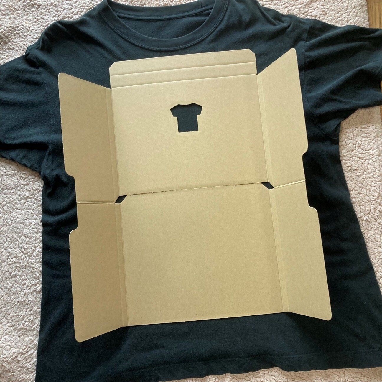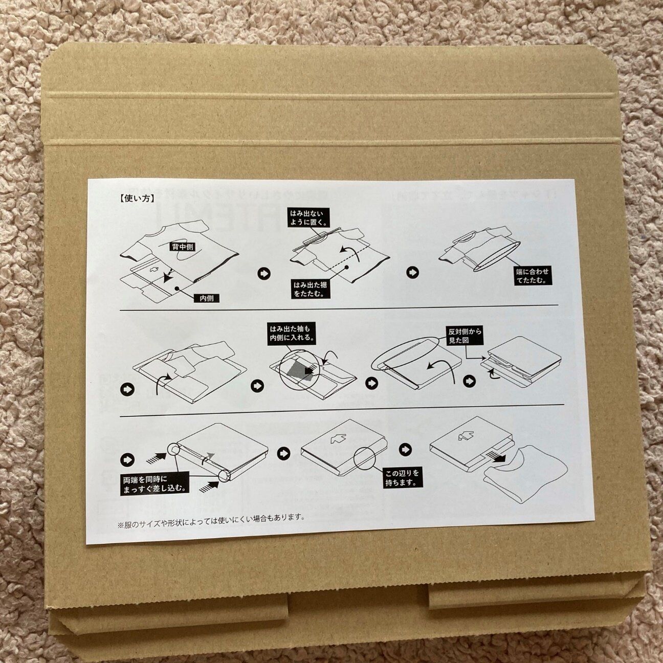 「TATEMU」は、Tシャツ専用の段ボールです。柔らかいTシャツを「TATEMU」といっしょに畳みこめば、ブックサイズのTシャツ収納箱ができあがり、というもの。