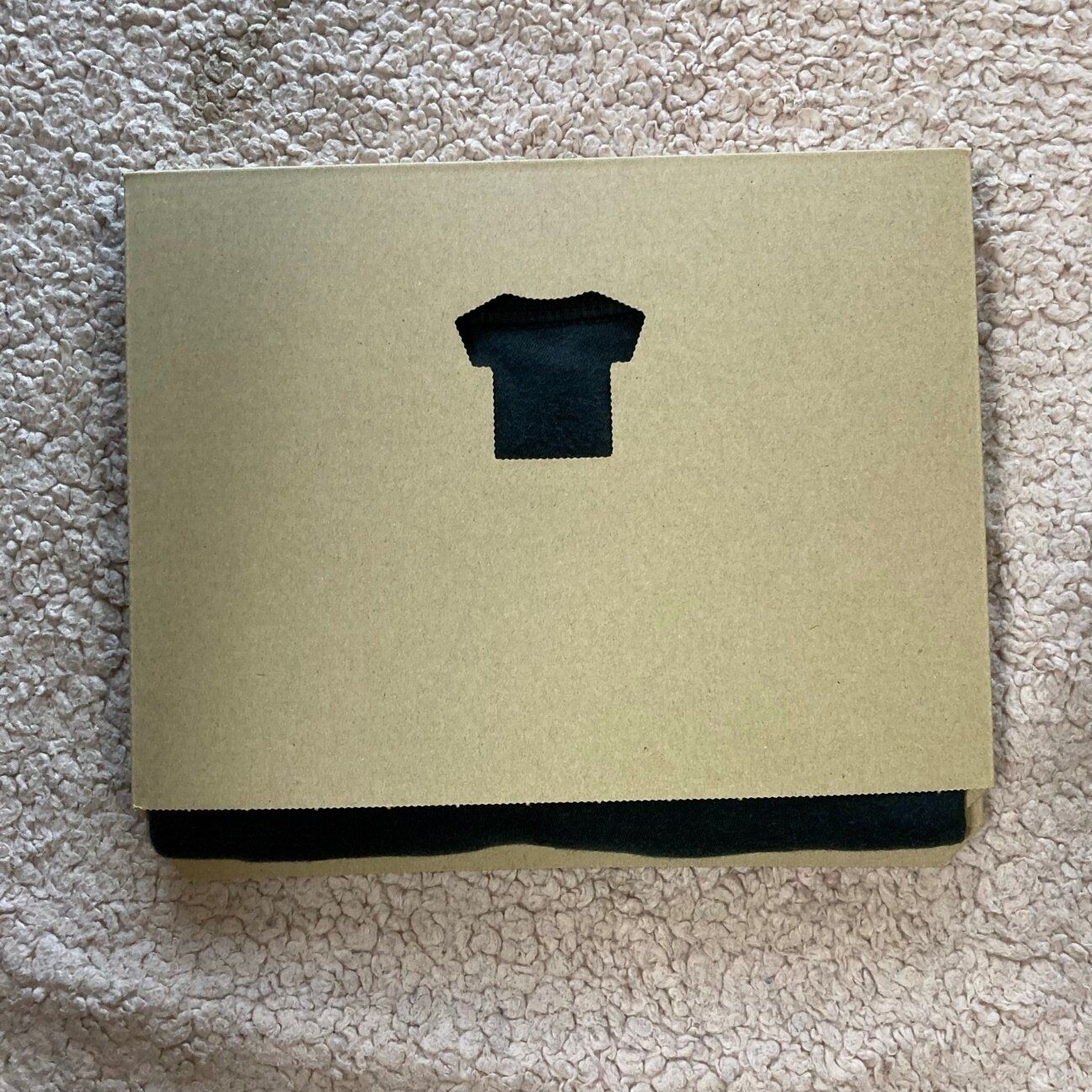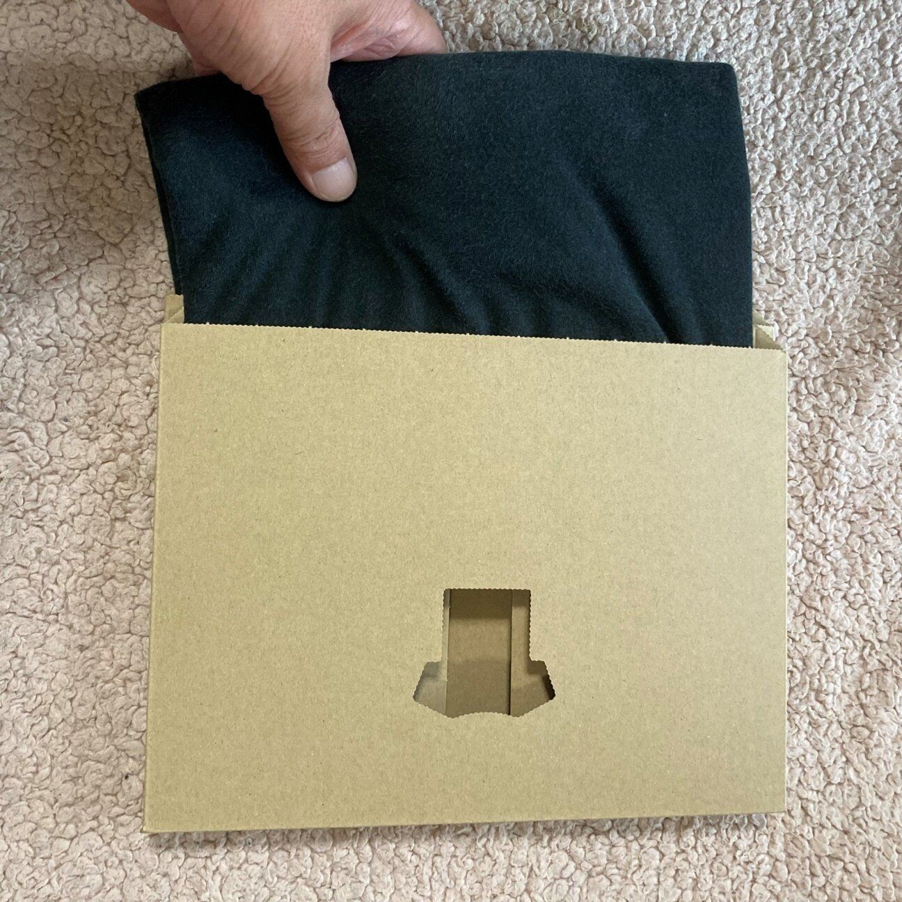 片側の口は大きく開いて、本棚に並べても色がよくわかるようになっています。また、本体にはTシャツ型の穴が開いていているので、Tシャツのデザインが見えるように折りたためば、Tシャツのデザインも確認できます。ちょっと気が利いていますよね。