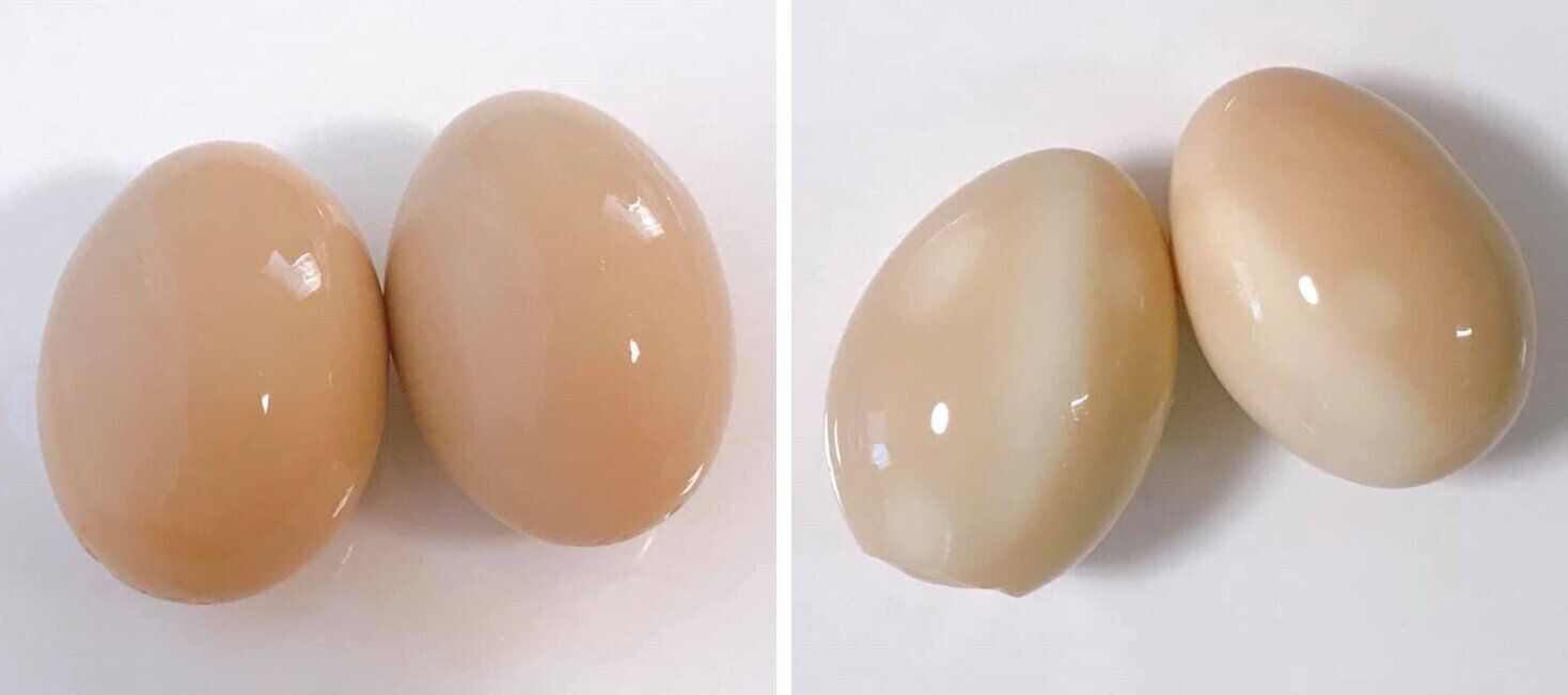 食料保存袋に同じように100mlのめんつゆを入れ、1時間漬けてみました。その結果、味にはほとんど差はありませんでしたが、食料保存袋の中の空気を極力抜いていても色むらができてしまいました。(左)「味付けたまごメーカー」、(右)食料保存袋でつくったものです。