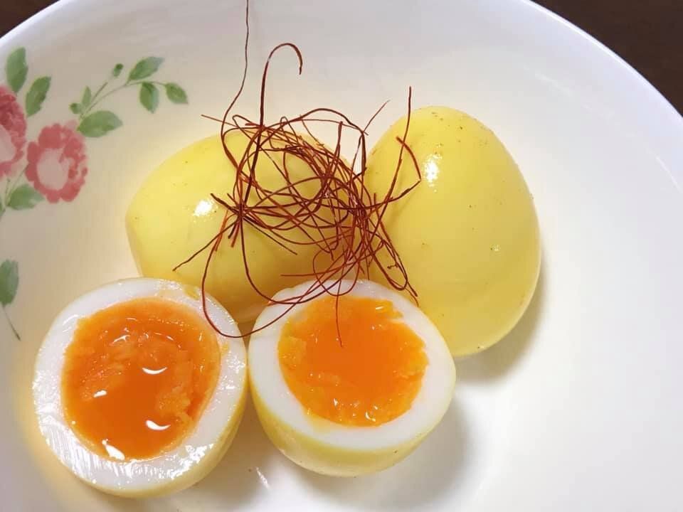 白だしにカレー粉を溶き、その調味料に卵を1時間漬けてみると、きれいな黄色に漬かりました。ドライカレーのトッピングにもよさそうですね。