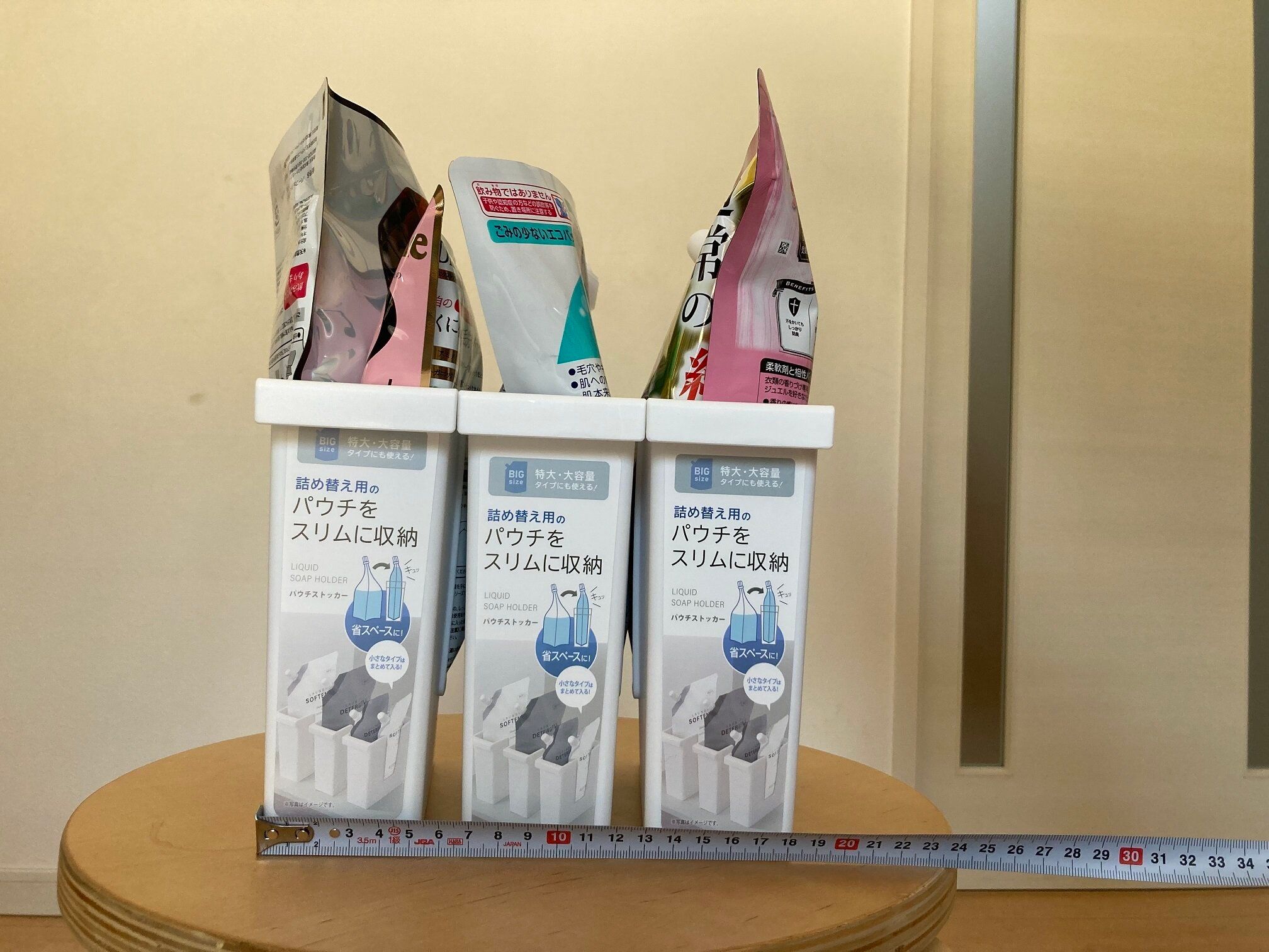 大きめパウチ含め4つ準備しました。パウチの幅を合計すると約30cmくらいでしょうか。これをパウチストッカーに入れると……