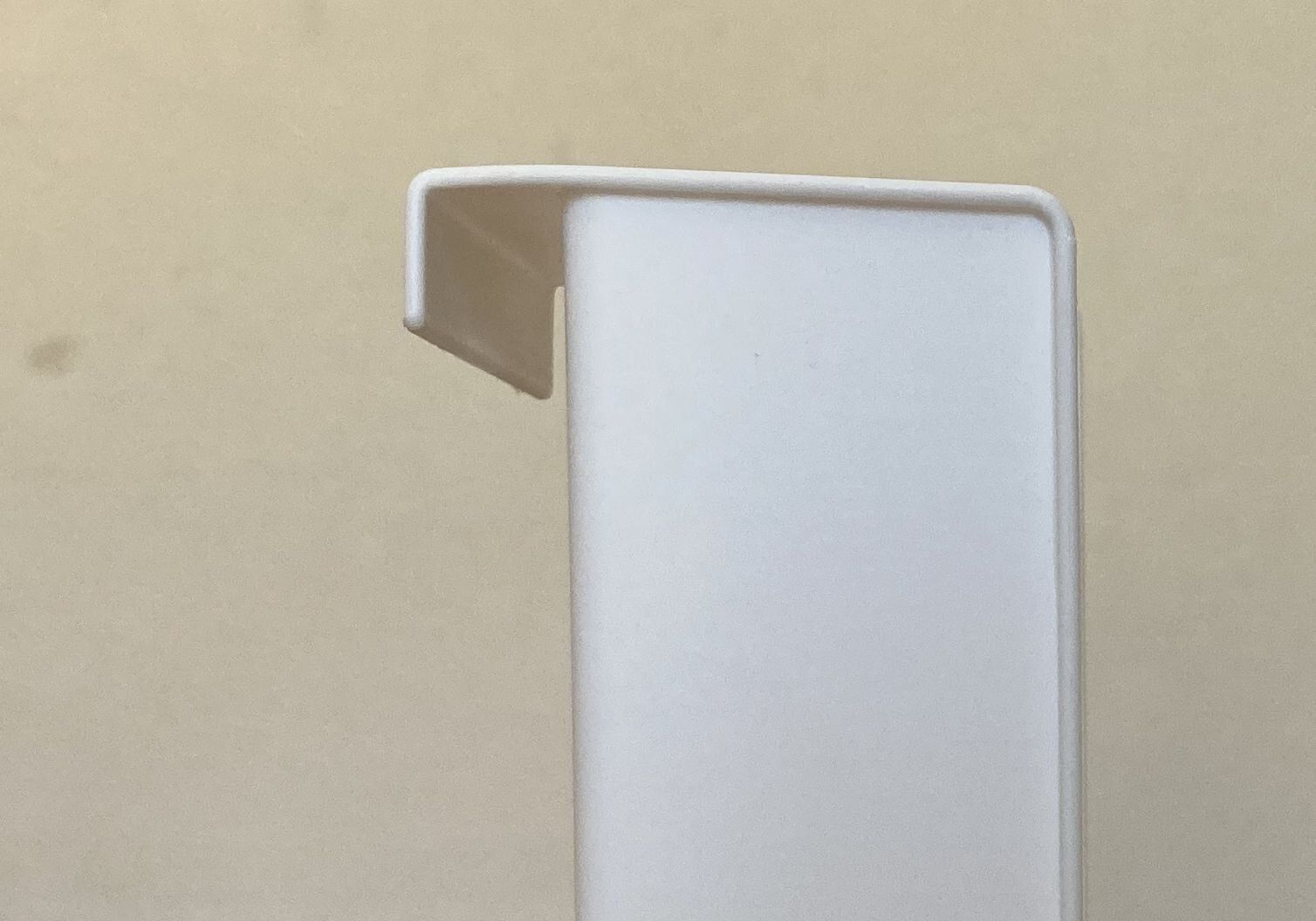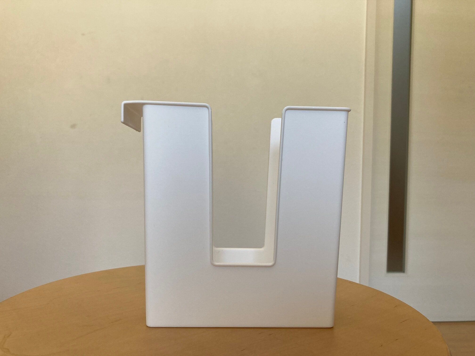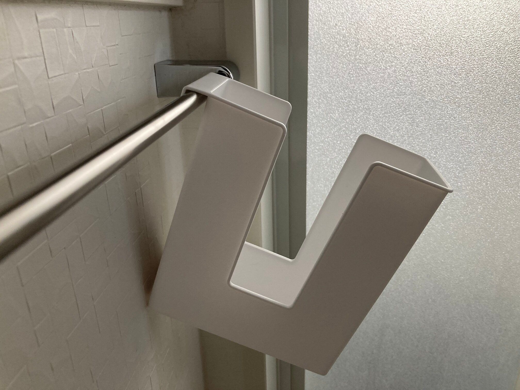 この左上の部分、どこかにひっかけられそう…とあちこちかけてみると、引き出しには厚みが足りずかからない。が、タオルかけなどのパイプにかけられることが判明。