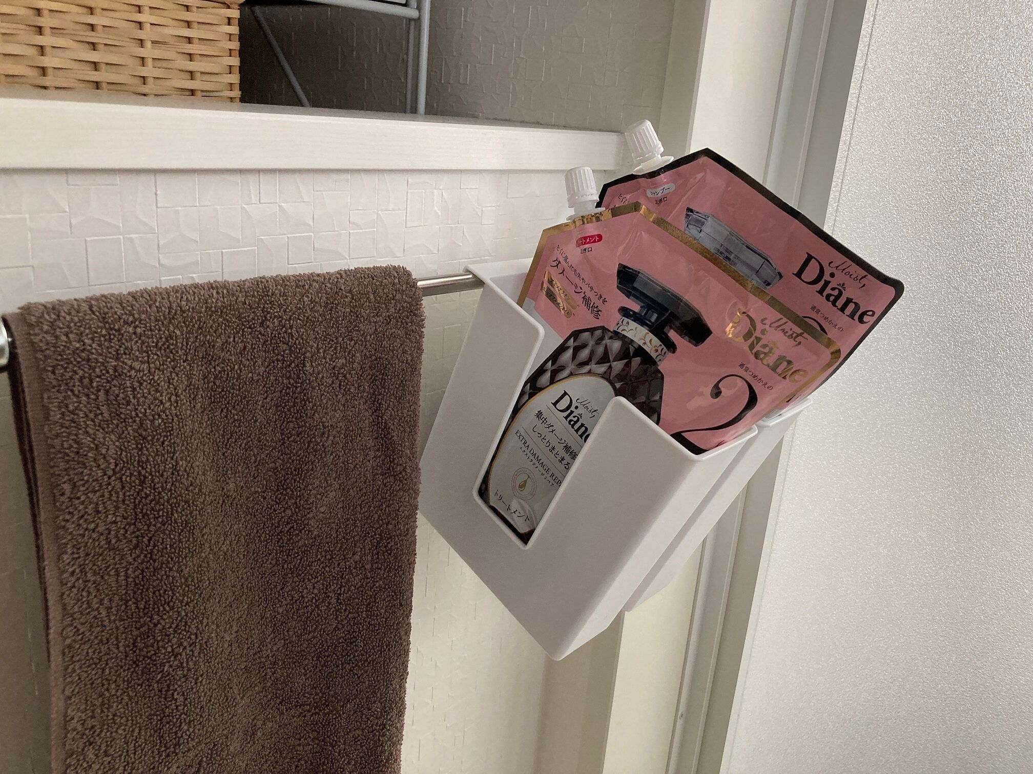 「シャンプーがもうすぐ終わりそう」と詰替えが必要な時期になったら、浴室の入り口にかけておけると便利ですね。
