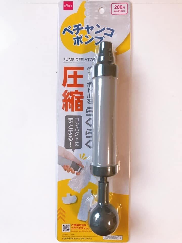 ダイソーの「ペチャンコポンプ」はペットボトルをらくらくに圧縮してくれるんです!ペットボトルはどんなサイズの飲み口でもジャストフィットしてくれます。価格は220円です。