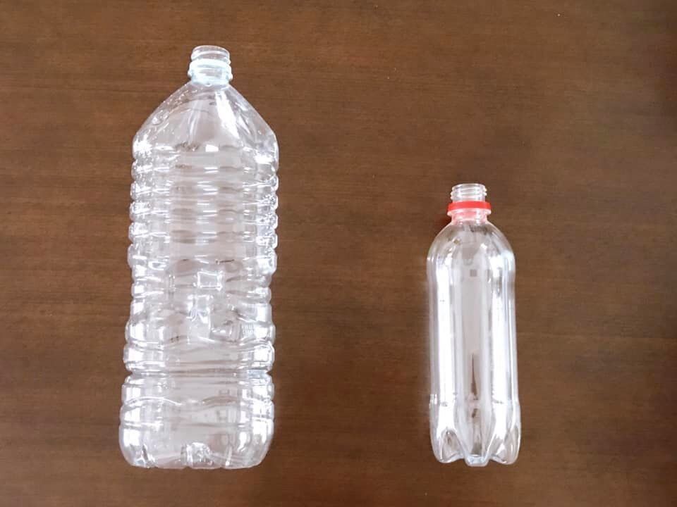 2Lと500mlのペットボトルを圧縮してみると、ここまでペチャンコになりました。手で潰したり、足で踏むよりペチャンコポンプが一番小さくなってくれそうです。