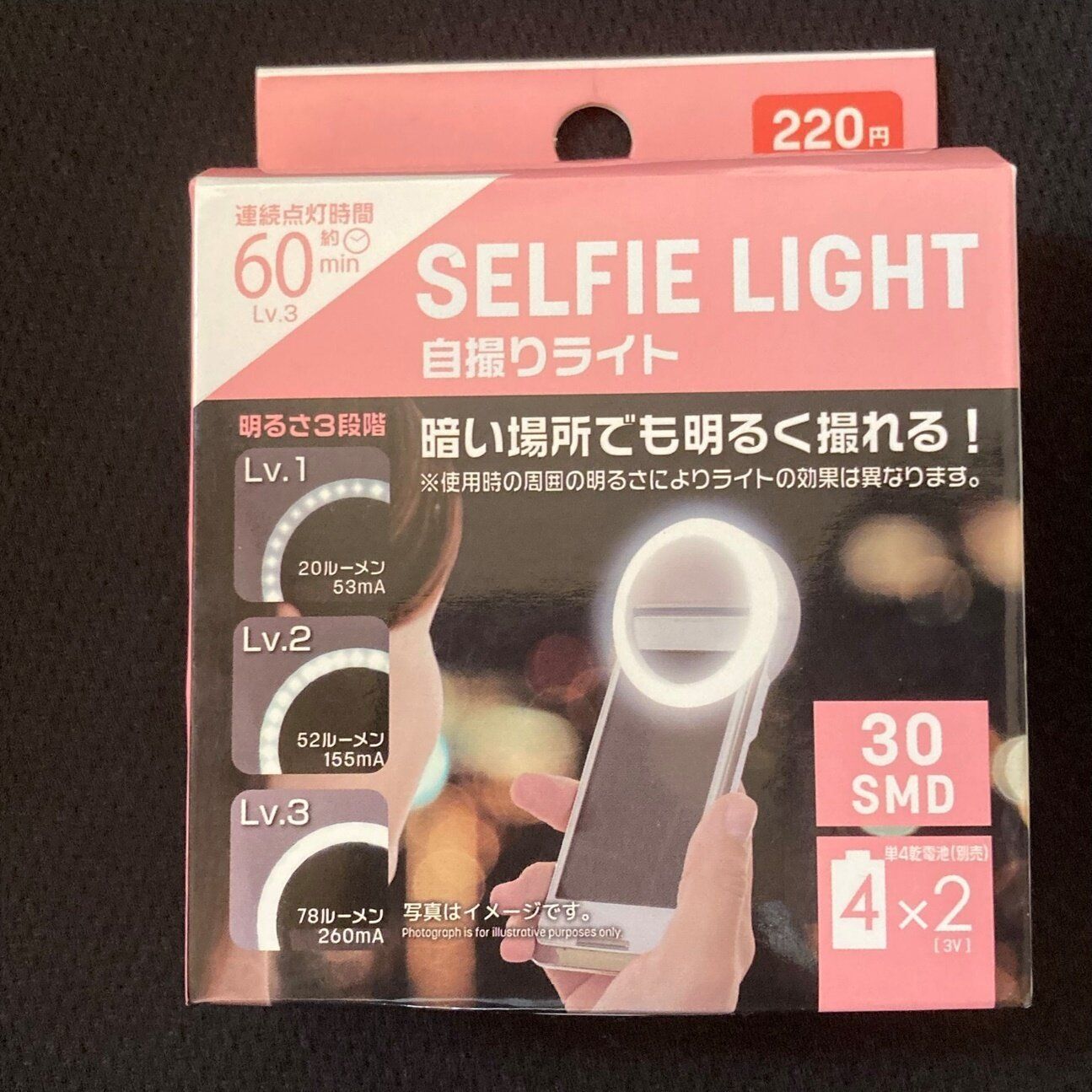 キレイな写真を撮るコツのひとつは、光をたくさんあてることです。ダイソーの「自撮りライト」は、スマホに挟むだけでいいので、簡単にキレイな写真が撮影できます。