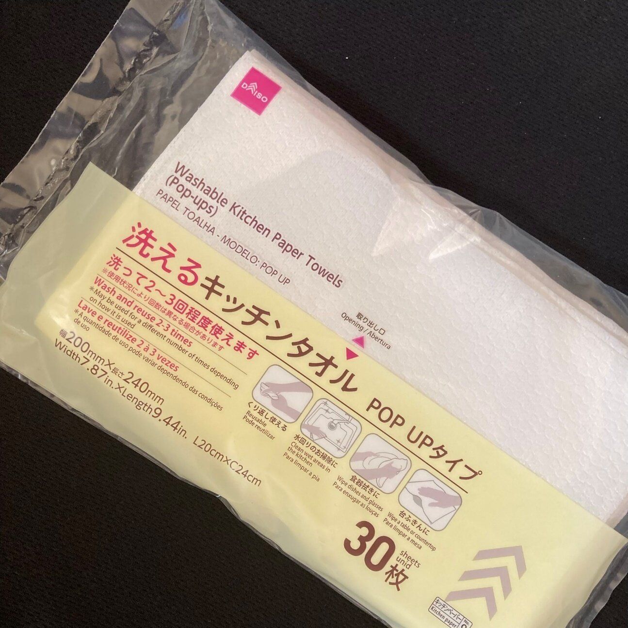 ロール状のものも販売されていましたが、私が買ったのは「洗えるキッチンタオルPOP UPタイプ」。30枚入りで価格は110円。