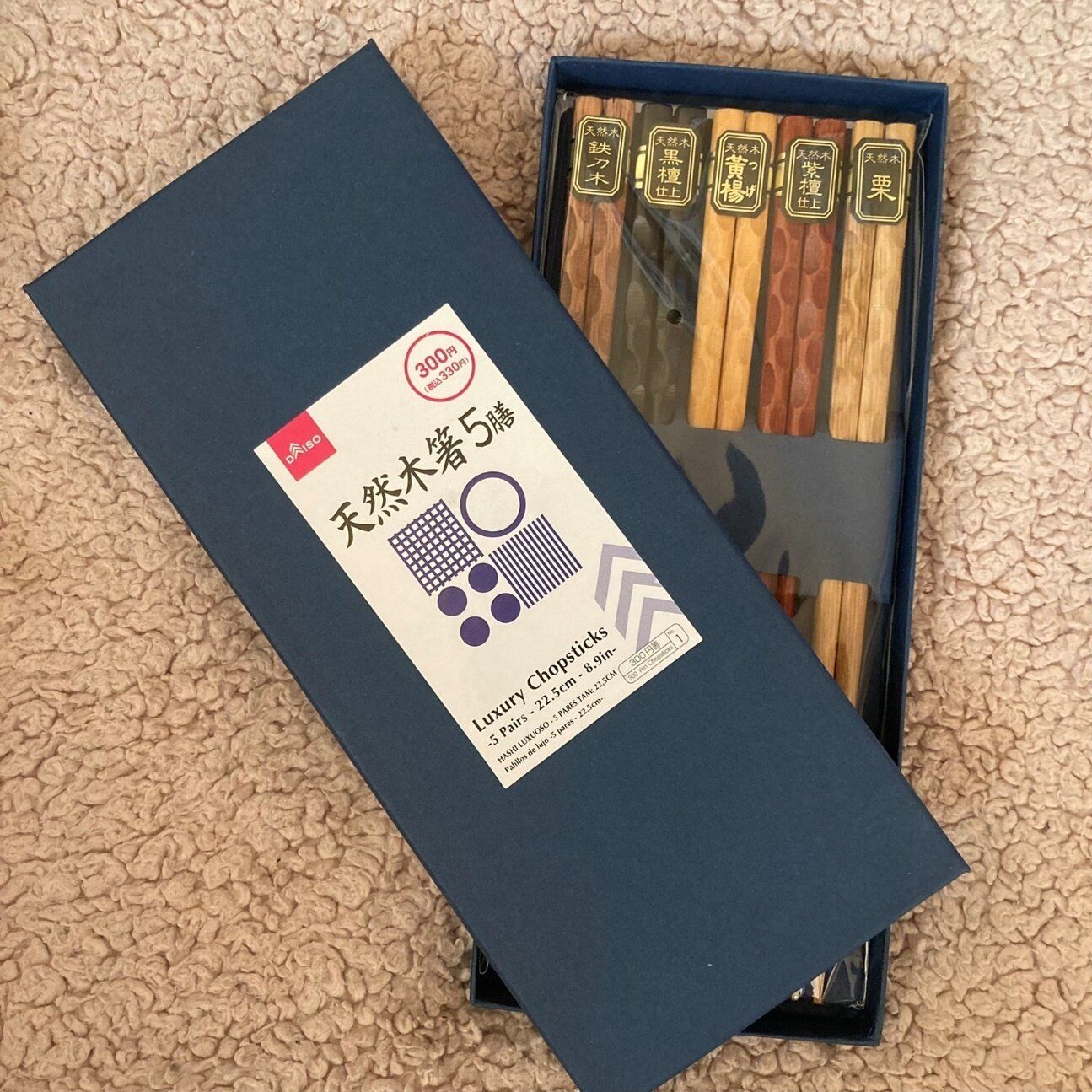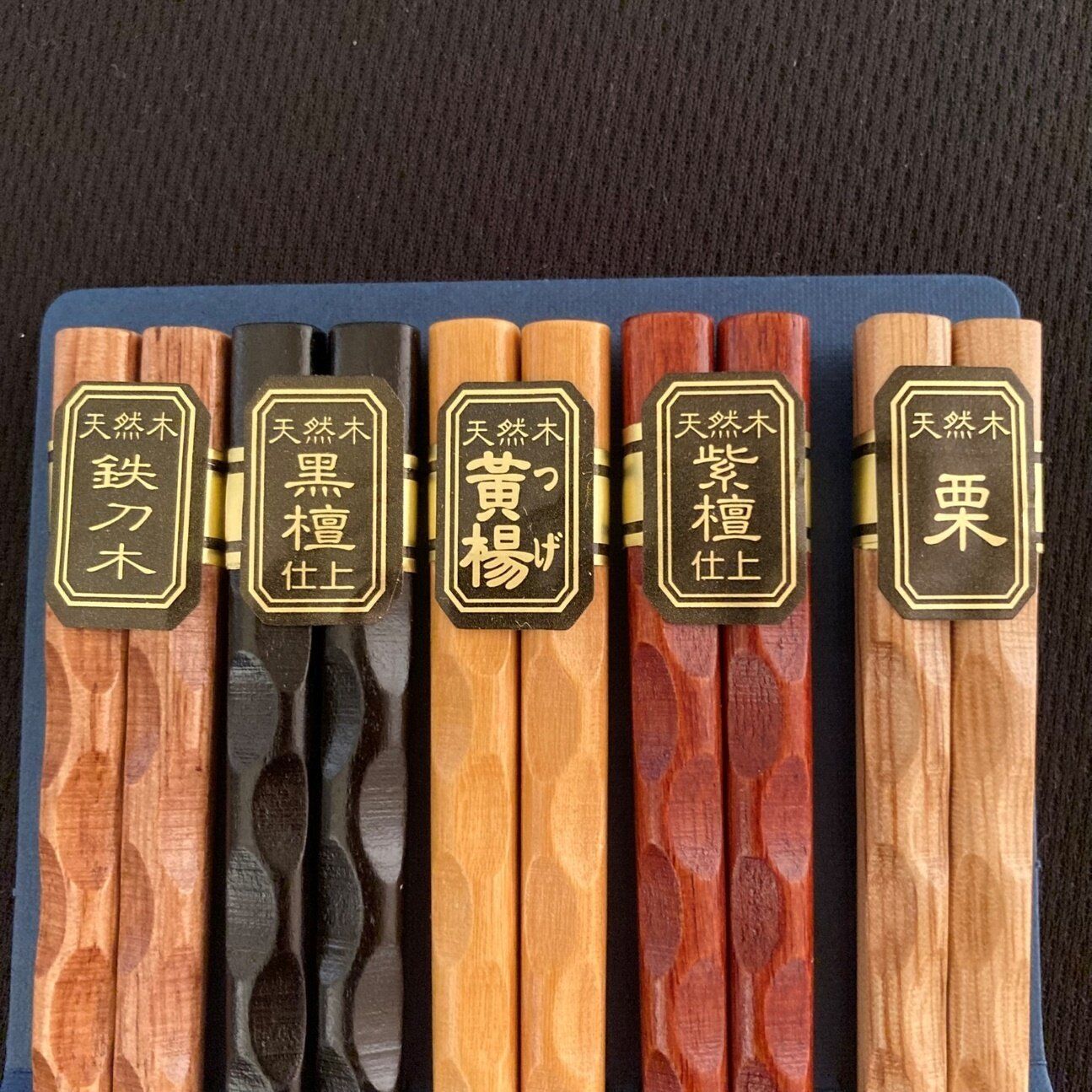 天然木の鉄刀木、黒檀仕上、黄楊、紫壇仕上、栗、こんな立派なお箸が5膳も入って330円はありえないです。今年いちばん驚いた商品かもしれません。