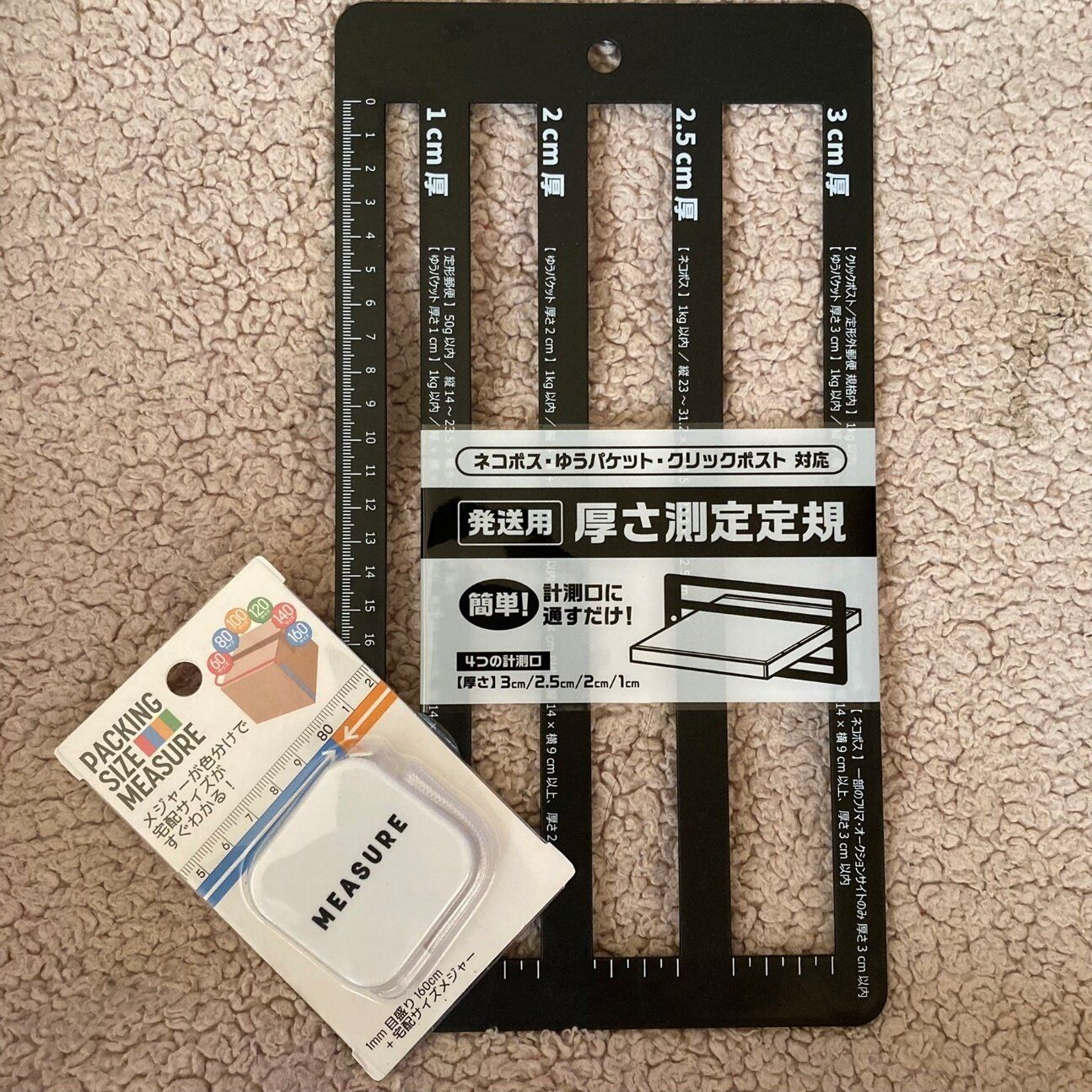 お届けサイズは可能な限り小さくして、送料は安く仕上げたいです。だから私は、ダイソーで買った「パッケージングサイズメジャー」「発送用厚さ測定定規」(ともに110円)を使っています。