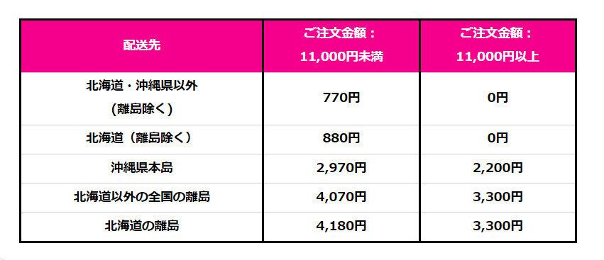 送料は770円(税込:北海道は880円)で、総注文金額が11,000円以上になると送料無料です。沖縄県および離島へのお届けはできません。