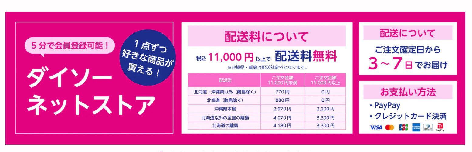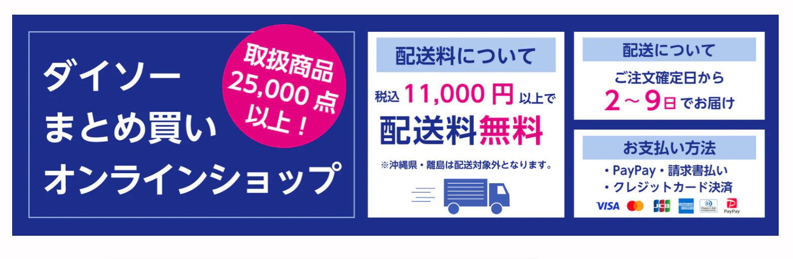 「ダイソーオンラインショップ」は、「ダイソーまとめ買いオンラインショップ」にリニューアルされています。