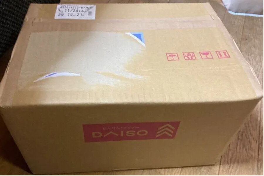 注文してからわずか2日後、ダイソーのロゴ入り段ボールで注文した商品が届きました。注文時に選べた最短の期日指定が7日後だったのに、思ったよりも早くてびっくり!