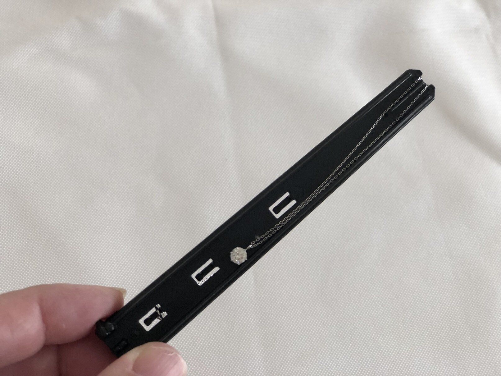 使い方は、ケース内にあるフックにネックスのチェーンを引っかけ、そのままケースの先端で折り返す形で反対側までチェーンをまわして最下部の突起にとおして、フタをするだけ。チェーン同士が接触しない構造なので、からみついたり、ほどけたりすることがないわけです。