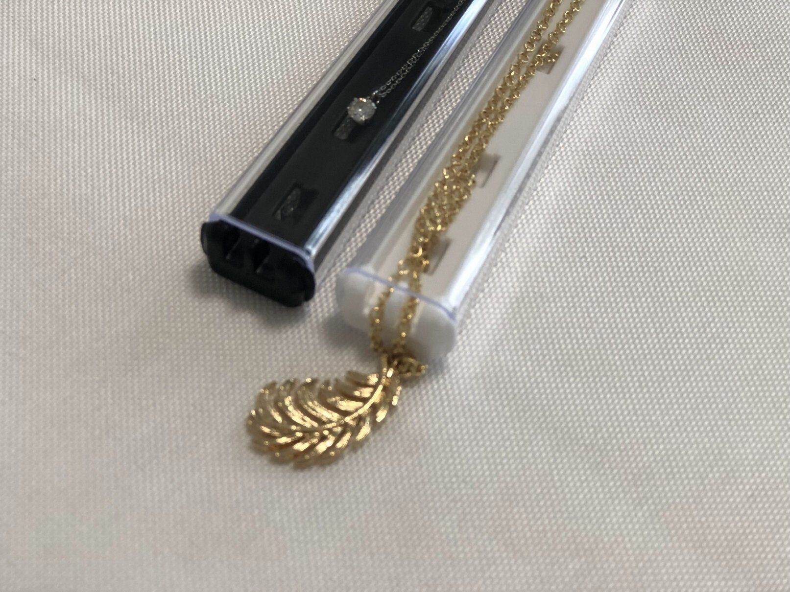 上部の穴からトップ部分だけだすことができるので、大きなモチーフつきのネックレスにも使用できます。ケースに収まらないサイズのモチーフがあっても大丈夫。