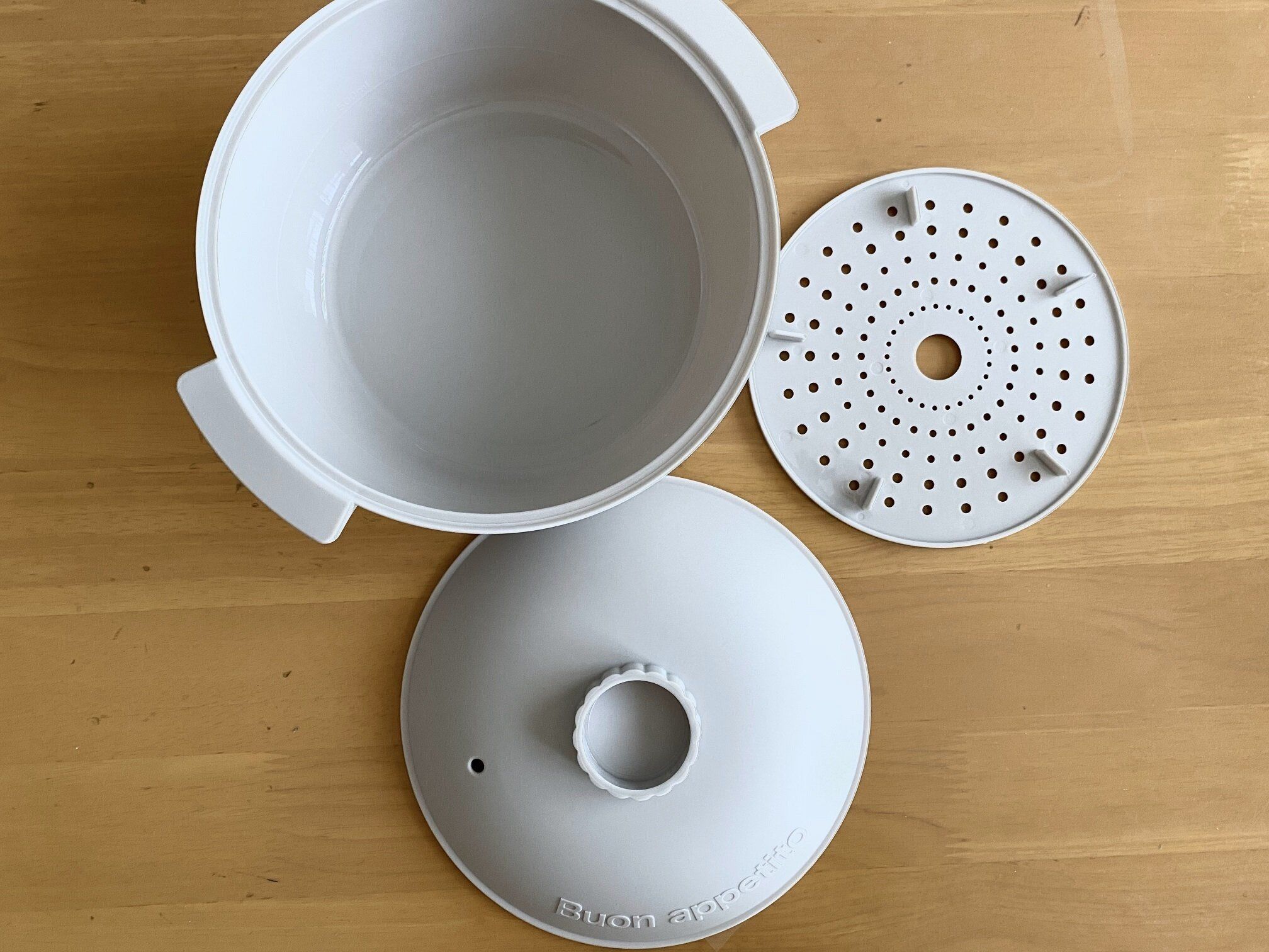 本体サイズは22×18.7×11.1cm。すのこが付属していて、こちらは蒸し野菜や焼きそばなどの水を切る必要があるメニューのときに使用します。