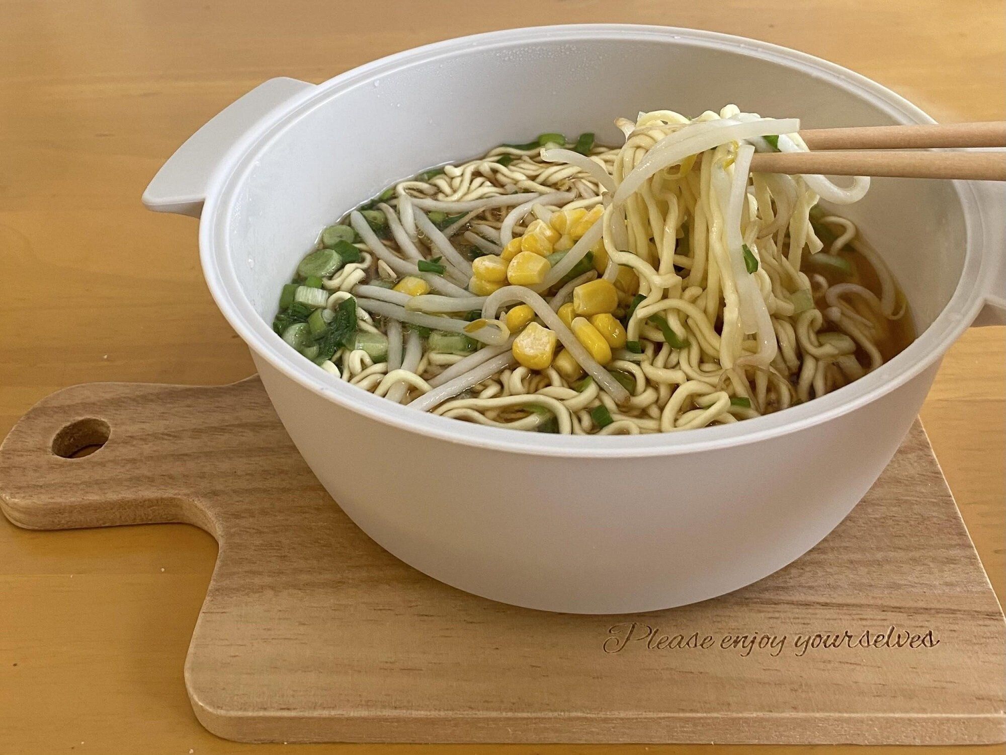 こちらの商品では乾麺だけでなく生麺も調理可能ですが、今回はまずインスタントラーメンをつくってみることに。