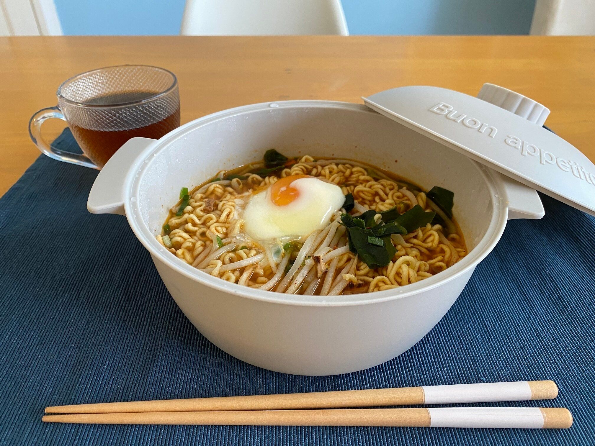 太麺で4分は煮込む必要がある、辛い韓国ラーメンもつくってみました。麺の下に野菜と乾燥ワカメを入れお湯を入れてレンジで4分半!お湯を電気ケトルで沸かしている間にレンジ温めでつくっておいた温泉卵を最後に添えてでき上がり。