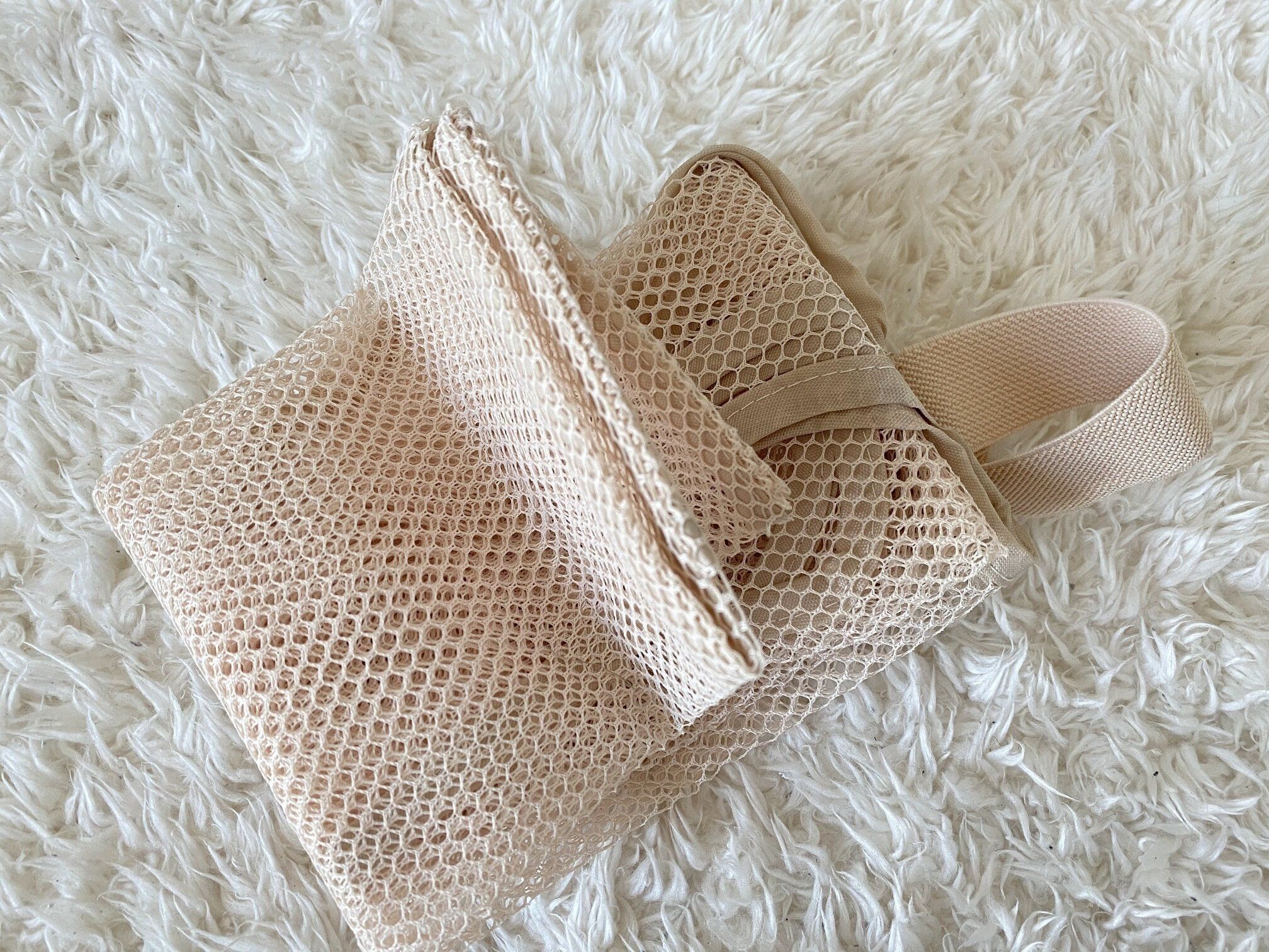 メッシュなどのシースルー素材も今年のトレンドのひとつです。こちらはエコバッグなので畳めて持ち歩きしやすく、お買い物バッグとしても便利。