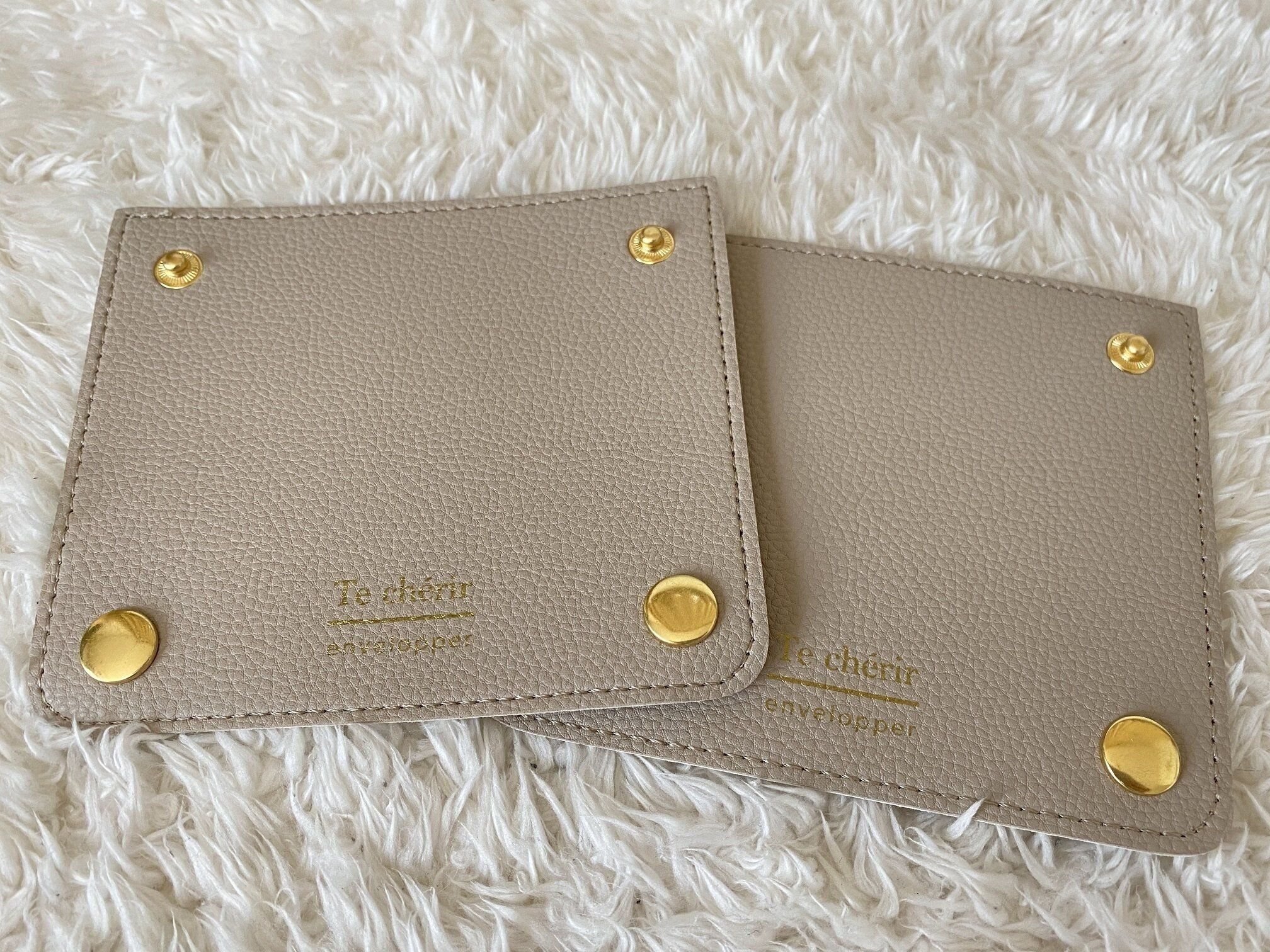 開いた状態で13×11cmあるので、持ち手の太さが3センチくらいまでなら使用可能です。合皮ですが、マットな質感にゴールドの金具とロゴが高見え要素で素敵なアイテムです。