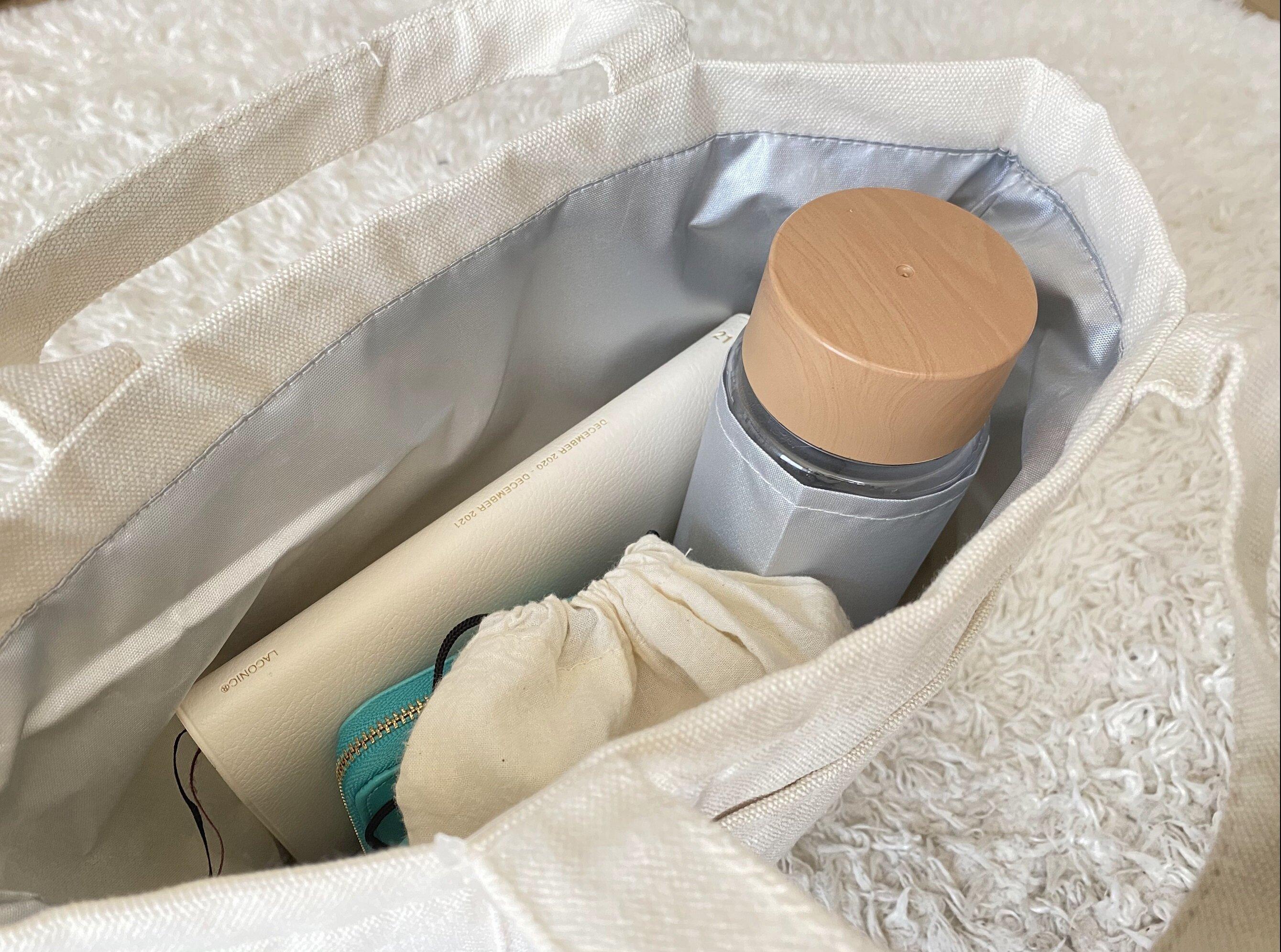 最後は「ランチトート」のご紹介です。見た目はキャンバス地のシンプルなバッグですが、実は内側がシルバーのアルミ素材なので保冷ができるんです。