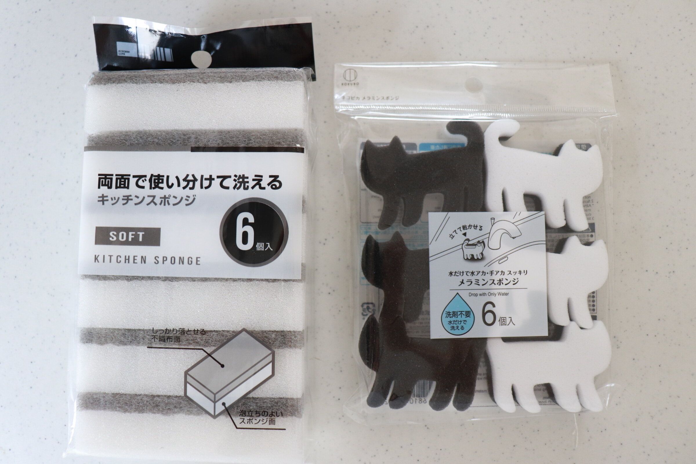 写真で紹介しているのは「両面で使い分けて洗えるキッチンスポンジ」と「水だけで水アカ・手アカスッキリ メラミンスポンジ」です。どちらも価格は110円。