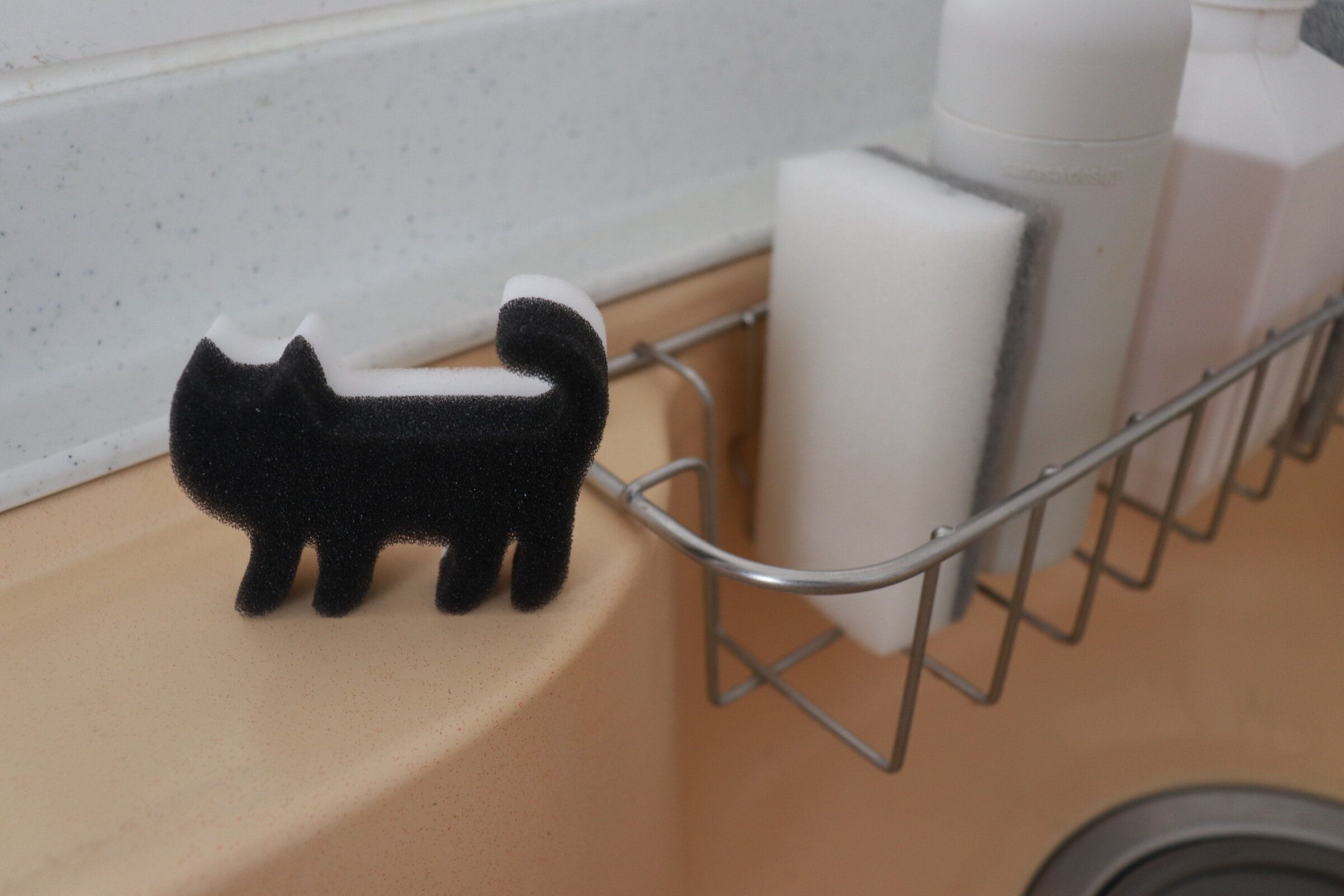 色が少なくなるだけでごちゃつき感がぐっと減るので、メラミンスポンジとふつうのスポンジを出しっ放しにしておいてもスッキリな見た目が叶います。