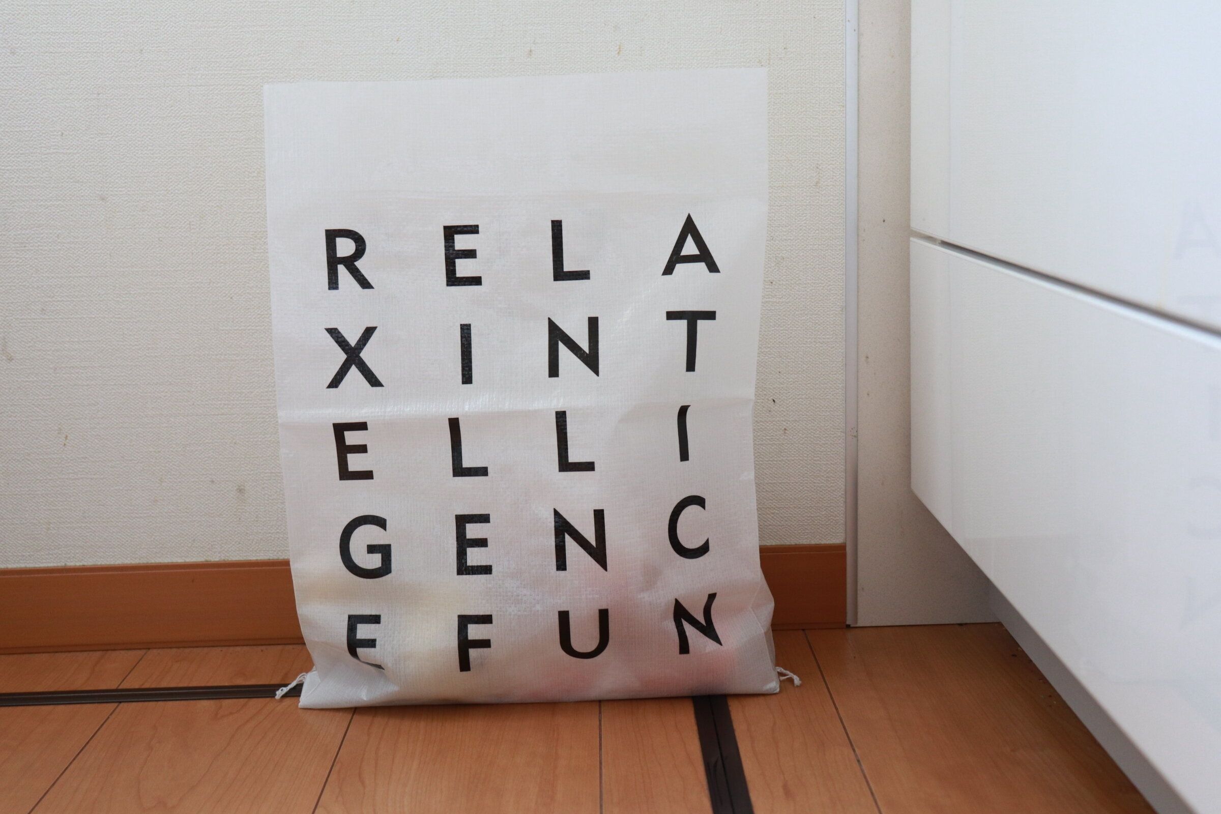 お米や野菜などもしまっておけるサイズのマルチストックバッグもキャンドゥで発見。アルファベットがおしゃれですね。写真はMサイズで約30×10×40cmです。
