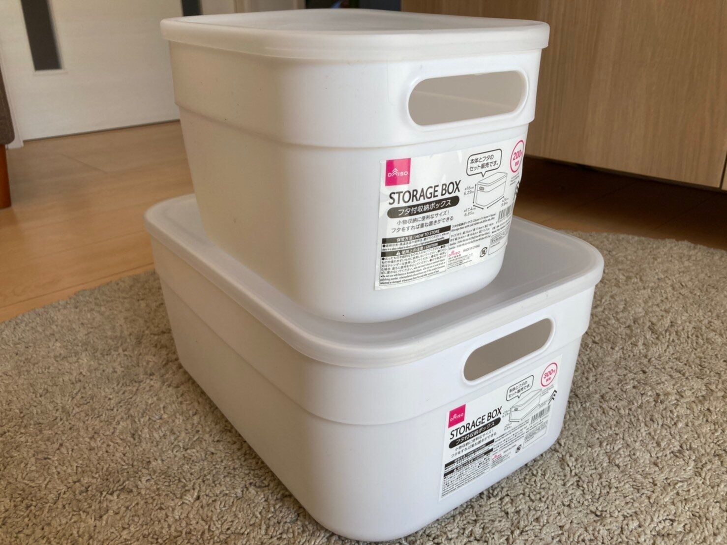 ご紹介するのは、ダイソーの「フタ付収納ボックス」です。サイズは何種類かありますが、今回選んだのは中と大サイズの2つ。価格は中サイズが220円、大サイズが330円となっています。