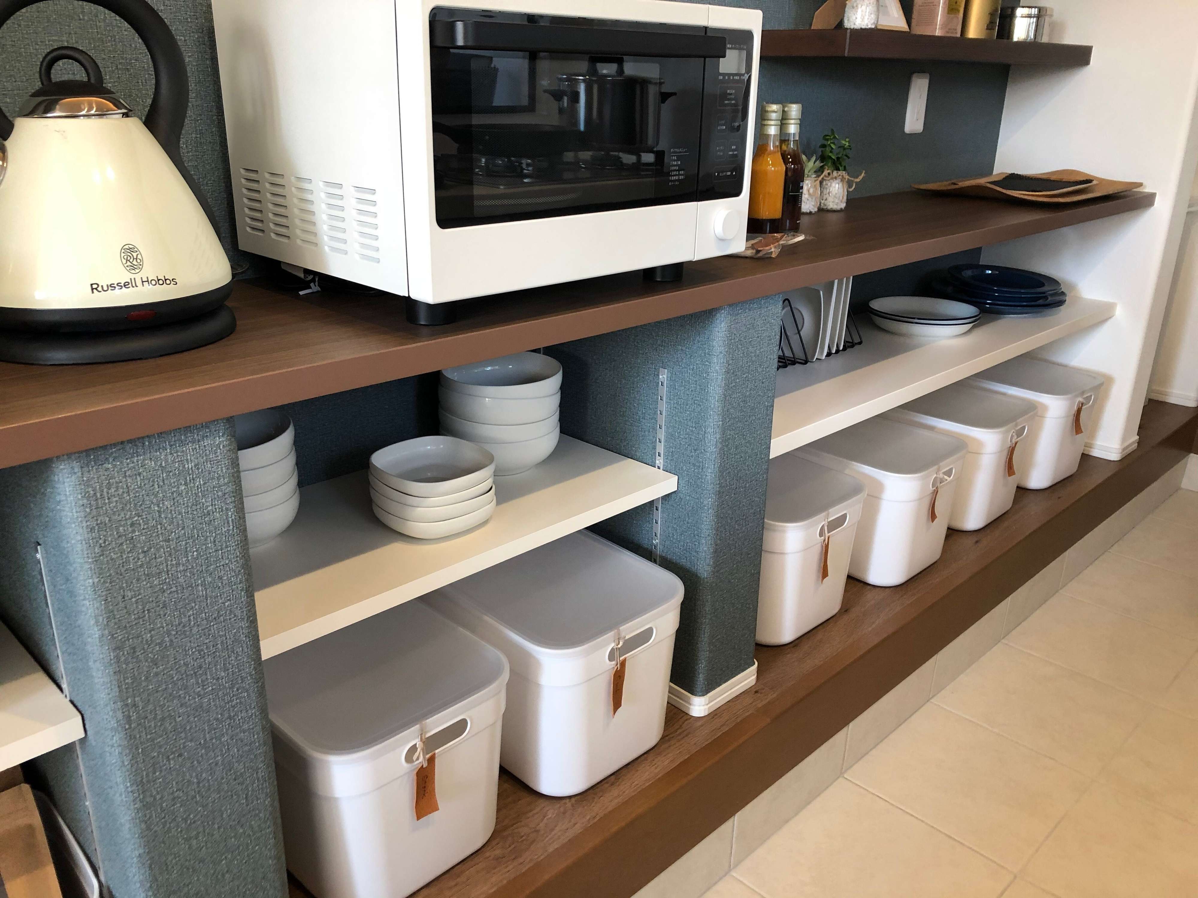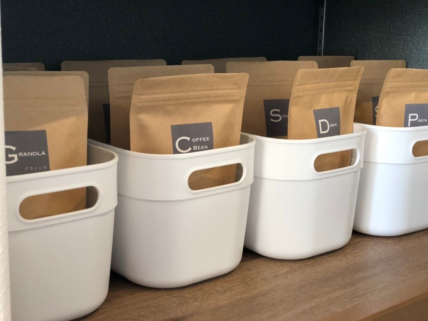 スタッキングもできるので空間に仕切りがない場所でも収納しやすいですね。食品や消耗品は生活によって量が増えたり減ったりします。