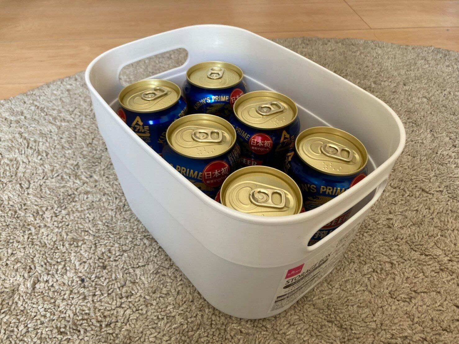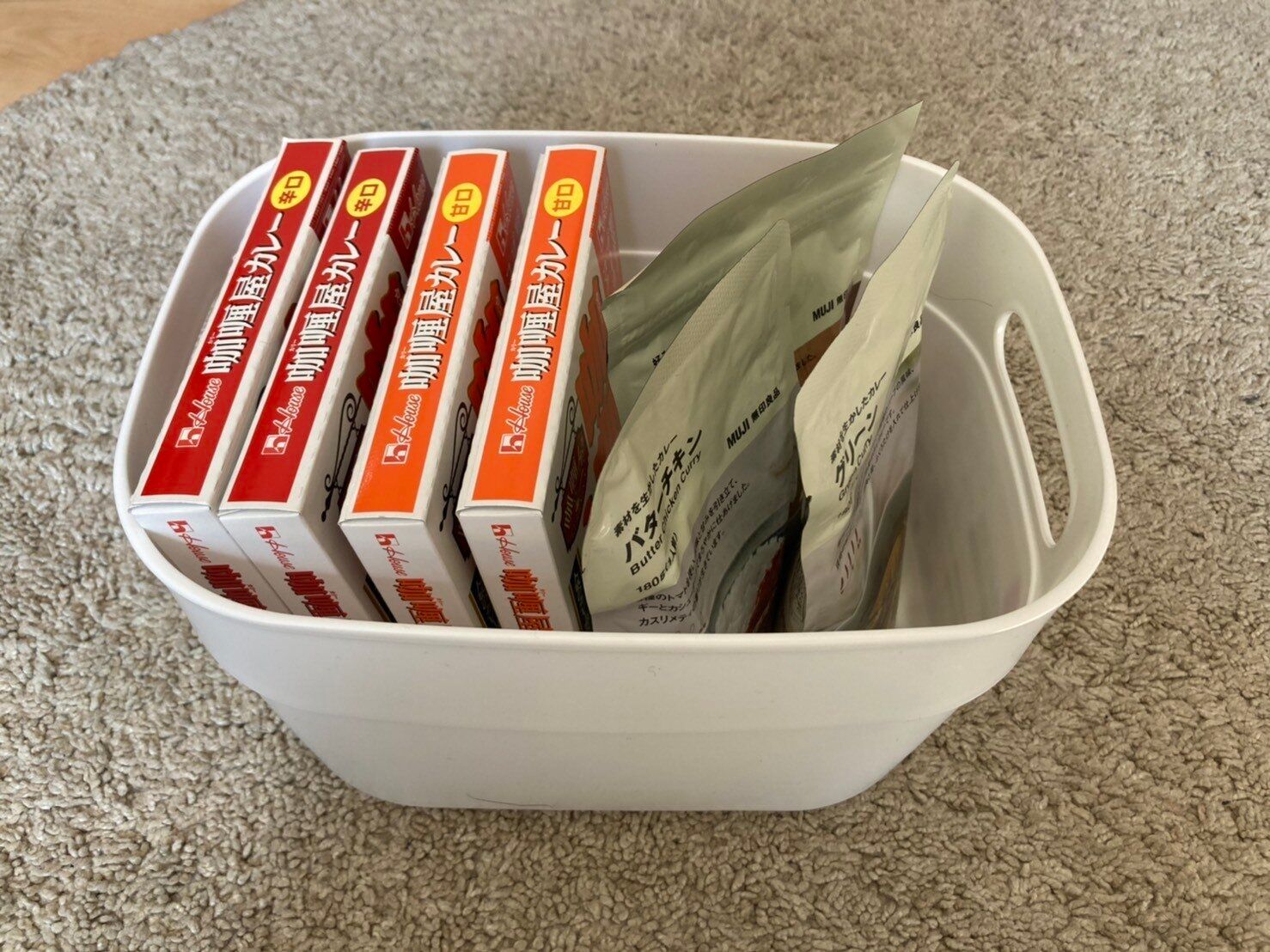実際にキッチンパントリー収納に使うためにいれてみました。350ml缶6本入り、フタも閉まりました。カレーレトルトは縦に入れた方がたくさん入りますが、横向きに入れてみたところ6箱入りフタが閉まりましたよ。