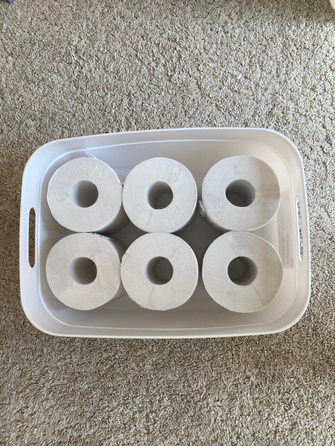例えば、生活消耗品のストック分を収納し保管しておくのにも便利。ティッシュはなんと5箱買ってきたそのまま入っちゃいました。また、トイレットペーパーも画像のとおりにフタをしての収納が可能!