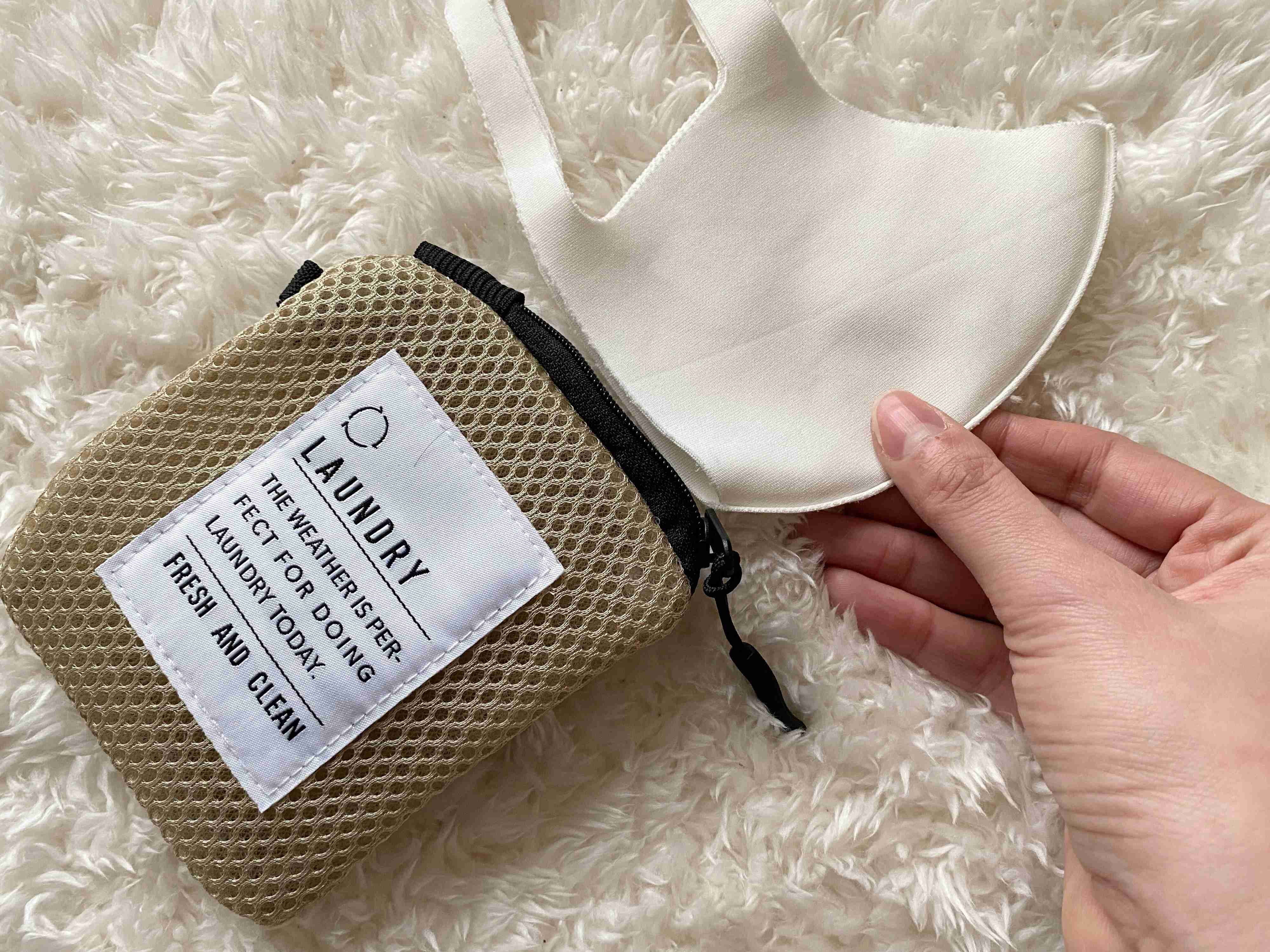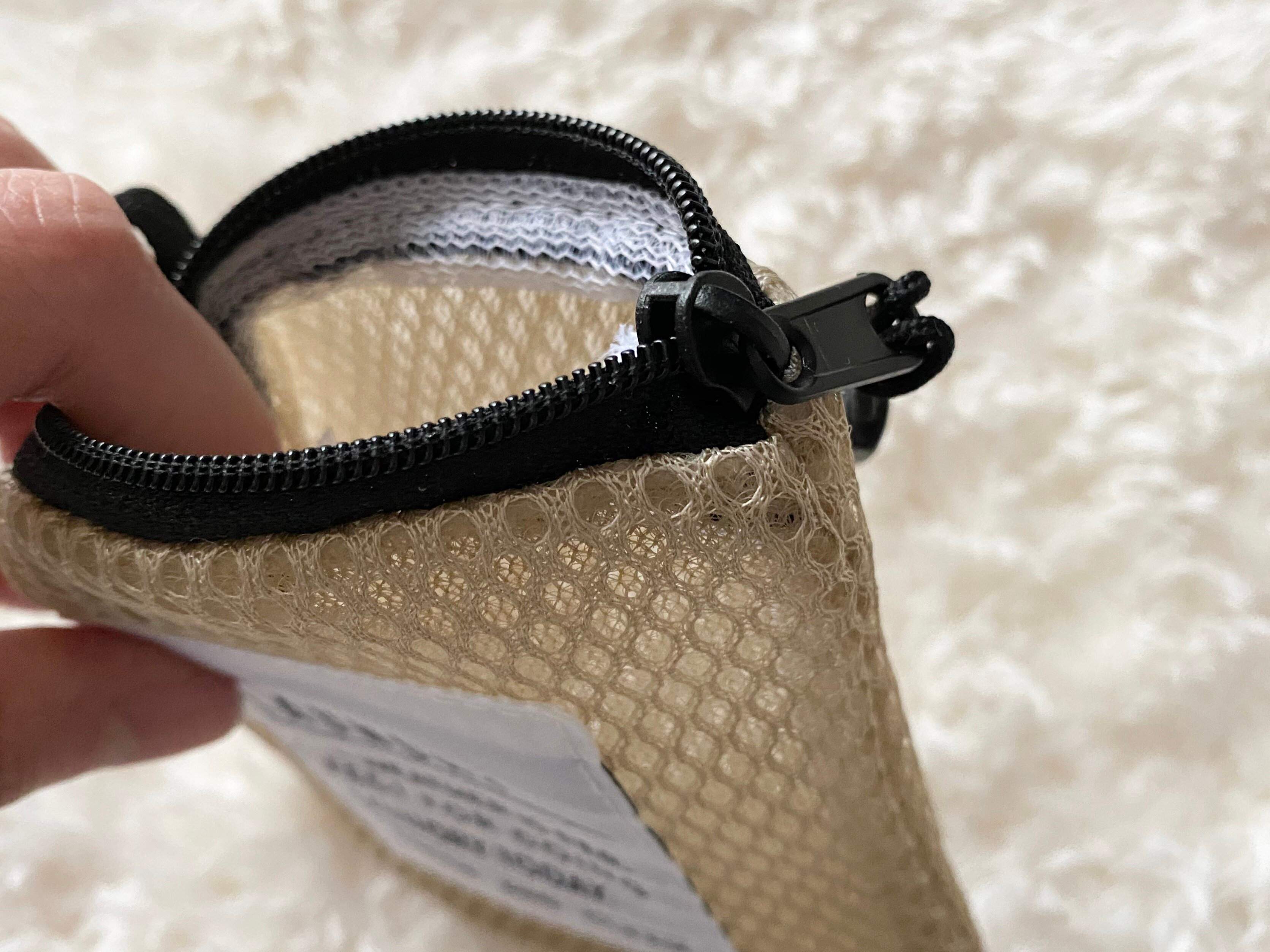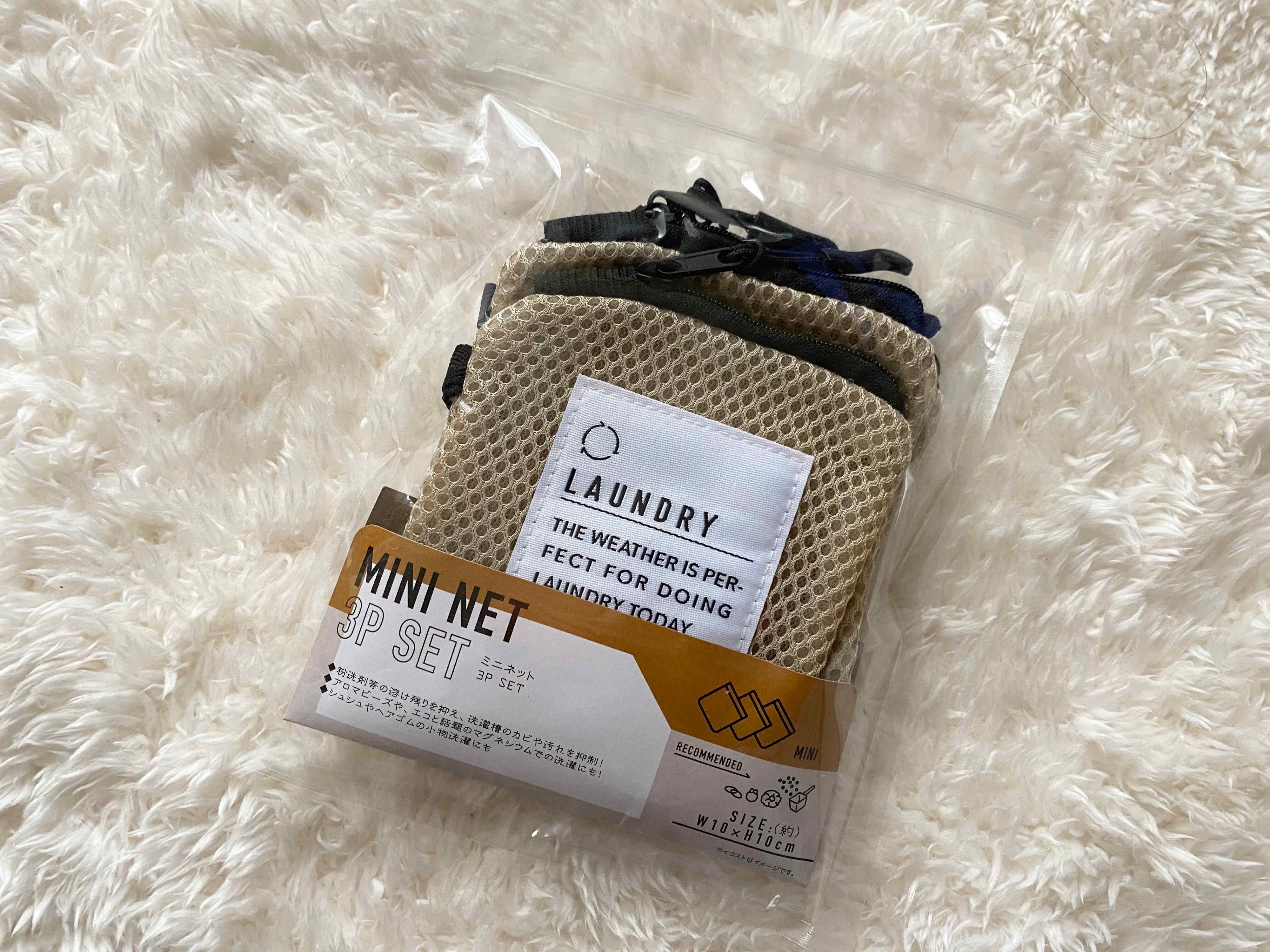 スリーコインズの「ミニネット3P SET」(330円)は、10×10cmサイズのポリエステル製でフワフワなミニネットが3個セットになった商品。ベージュに黒のファスナーと、引っかけるのに便利なループがついていてランドリーのロゴもかわいいです。