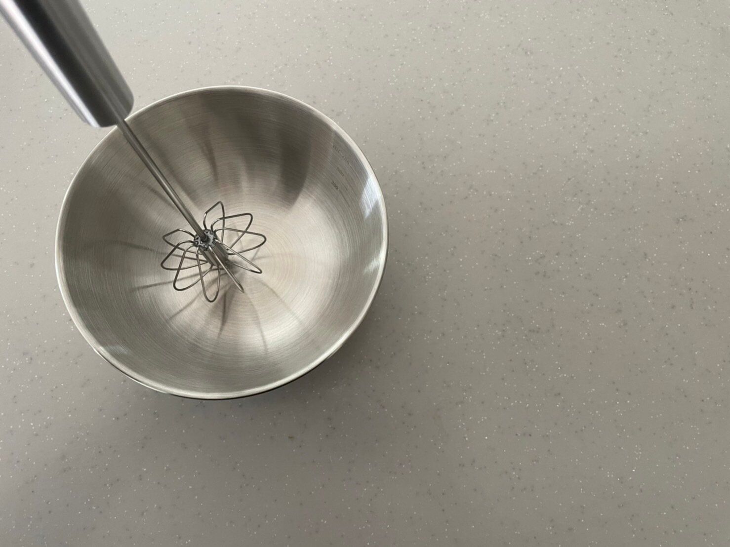 こちらの泡立て器は電源・電池不要で、取り出してすぐに使うことが可能。使い方は、ボウルに混ぜたい材料を入れ、泡立て器を垂直にして上から押すだけです。上から押すと自動で回転する仕組みになっていて、商品名の通り「半自動」というわけです。
