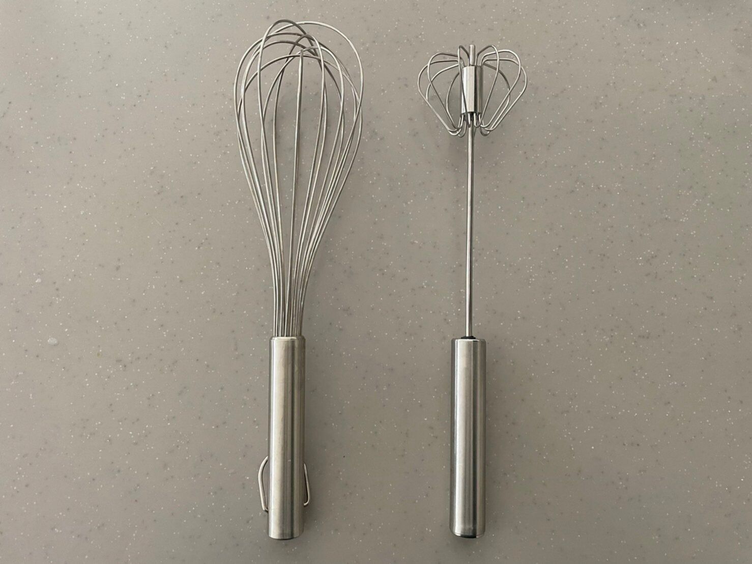 通常の泡立て器と比べると、全体的な長さや持ち手部分の形状にはそんなに違いはありませんが、まぜる部分がとてもコンパクトな設計になっているせいか、重さは軽め。