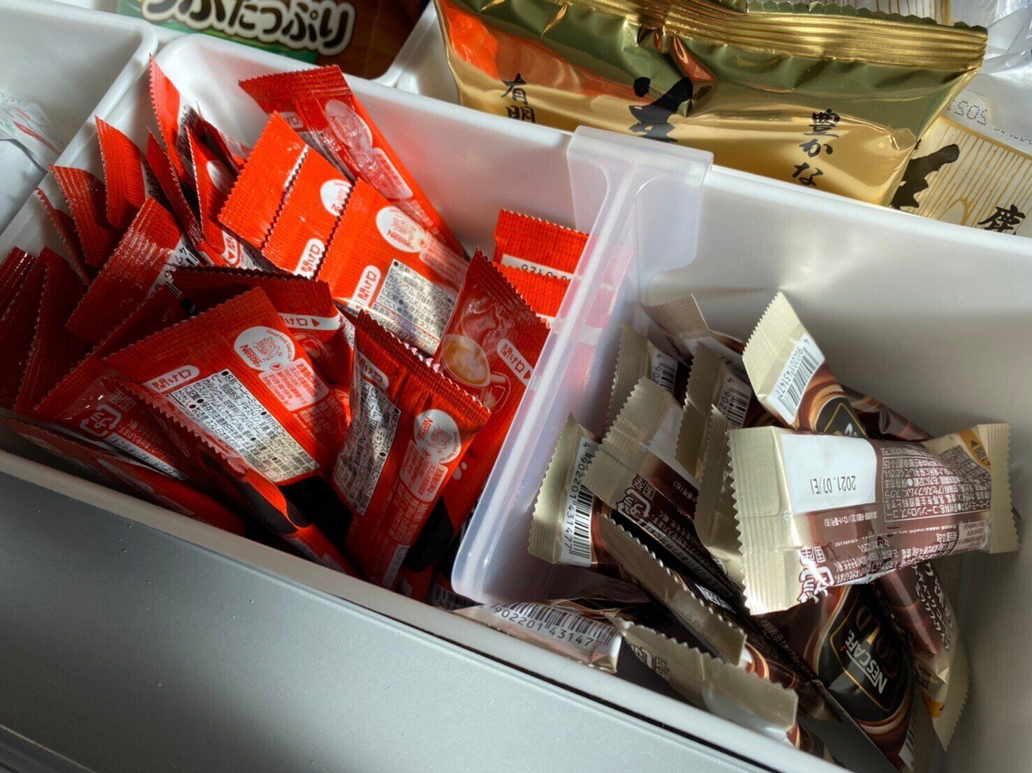 コーヒースティックやティーバッグ、調味料などの箱や袋が小さい食品ストックって、バスケットの中で倒れて散らばったり、見づらくなったりしますよね。でも、「バスケット用仕切り」を使えば、スッキリ整理&見やすくなります。