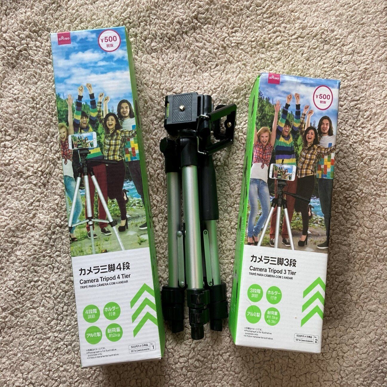 ダイソーでは、本格的なカメラ用三脚が500円で売っているのです。リュックに入れても気づかないくらい軽量コンパクトサイズです。高さの違いで、3段と4段の製品がありますが、値段は同じ500円。スマホホルダーが付属しているので、ひとつ持っていれば、スマホもカメラもビデオもすべての撮影機材が使えます。