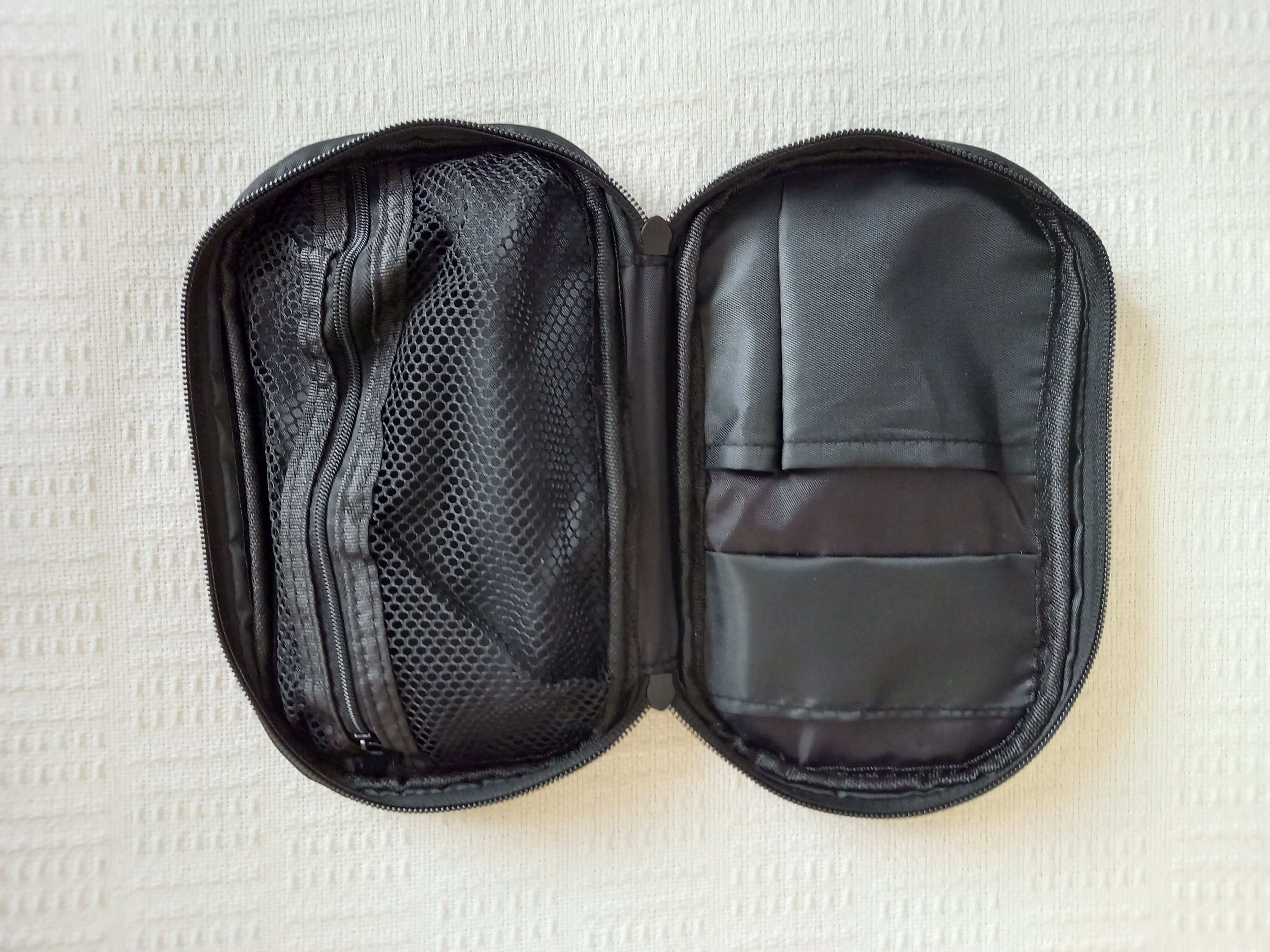 見た目はシンプルな黒のこのポーチ、サイズは横20×縦11×マチ3cmとなっています。特徴はとにかくしっかりとしたつくり。外側には持ち手がついていて、ファスナーを開けると、左側には、ちょっとした小物や長物を入れられるようなつくりになっていて、きちんと仕切られているので、スッキリ収納することができます。