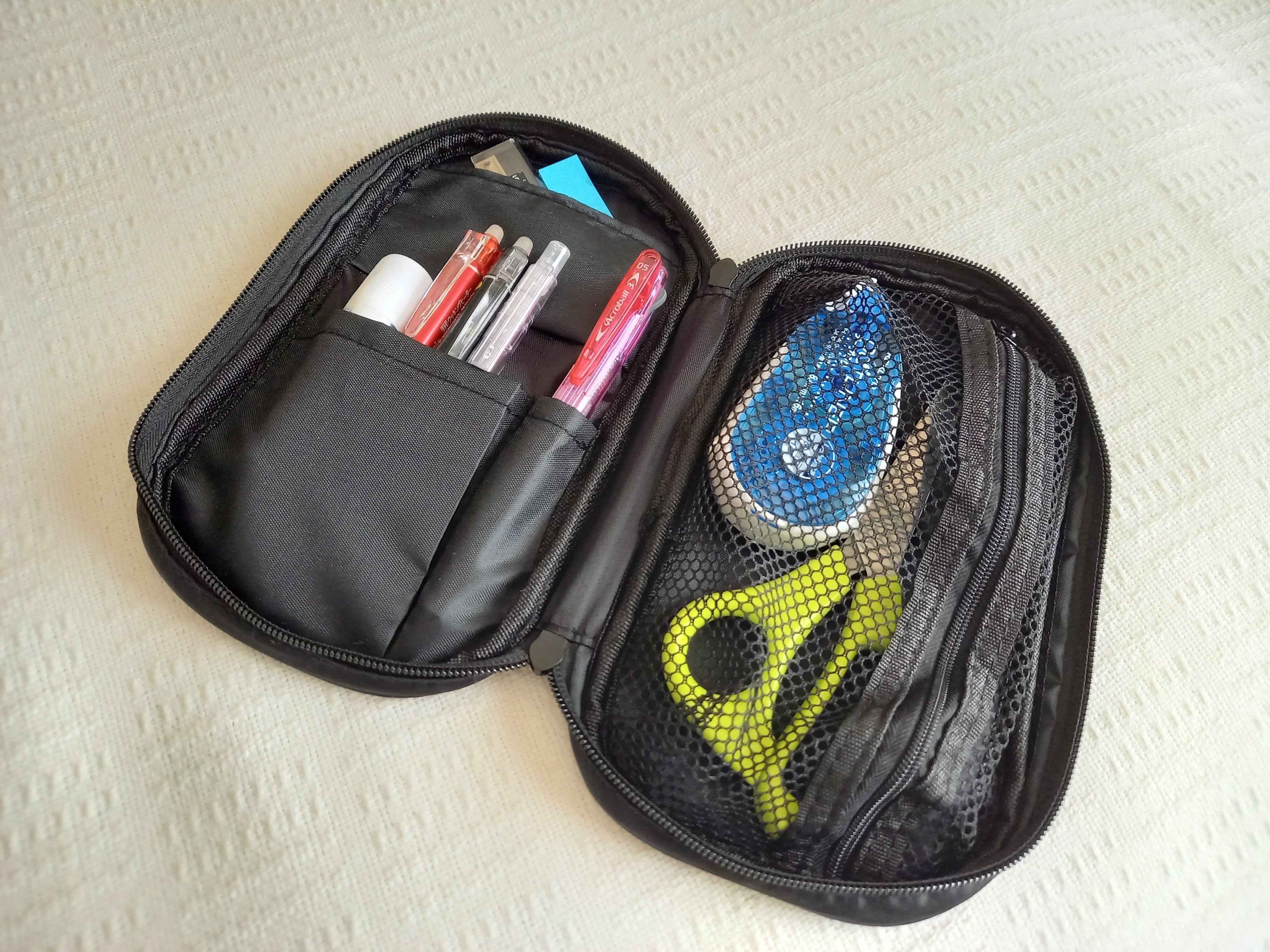 こまかく仕切られたケース内に、きちんとペンや文房具類が収まるので、よくあるペンケース内を探すという手間が減ります。付箋やハサミ、スティックのり、定規も入るので、取出しやすい、大容量のペンケースとしても活用間違いナシ!カラーも黒なので、飽きることのない大人なペンケースとして、抵抗なく取り入れられそうです。実際、私は仕事で片づけの作業現場に入る際に重宝しています。