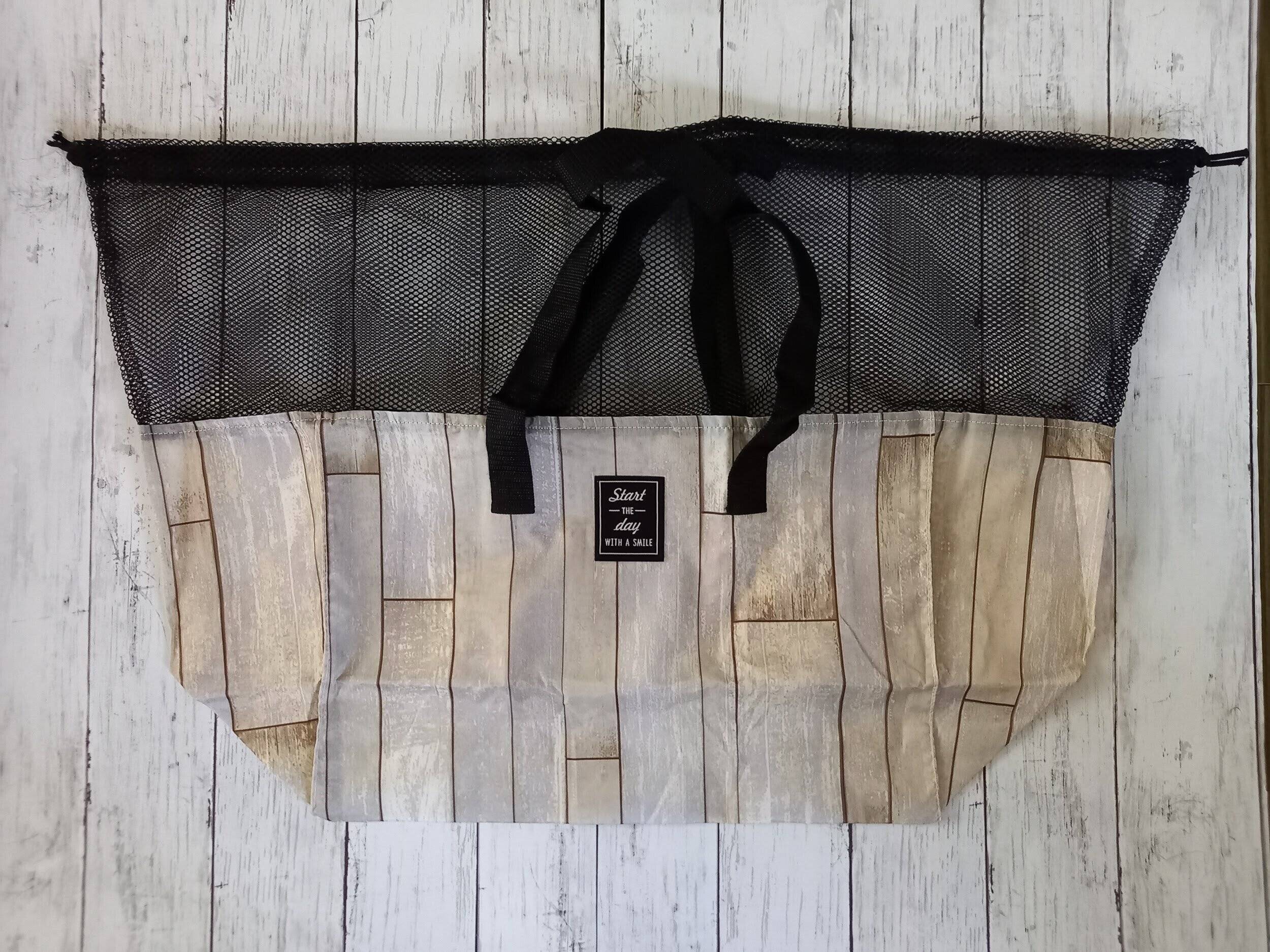 ポリエステル100%、中の汚れも拭きとりやすく、袋上部はメッシュで、持ち手もしっかりとしたつくりになっています。