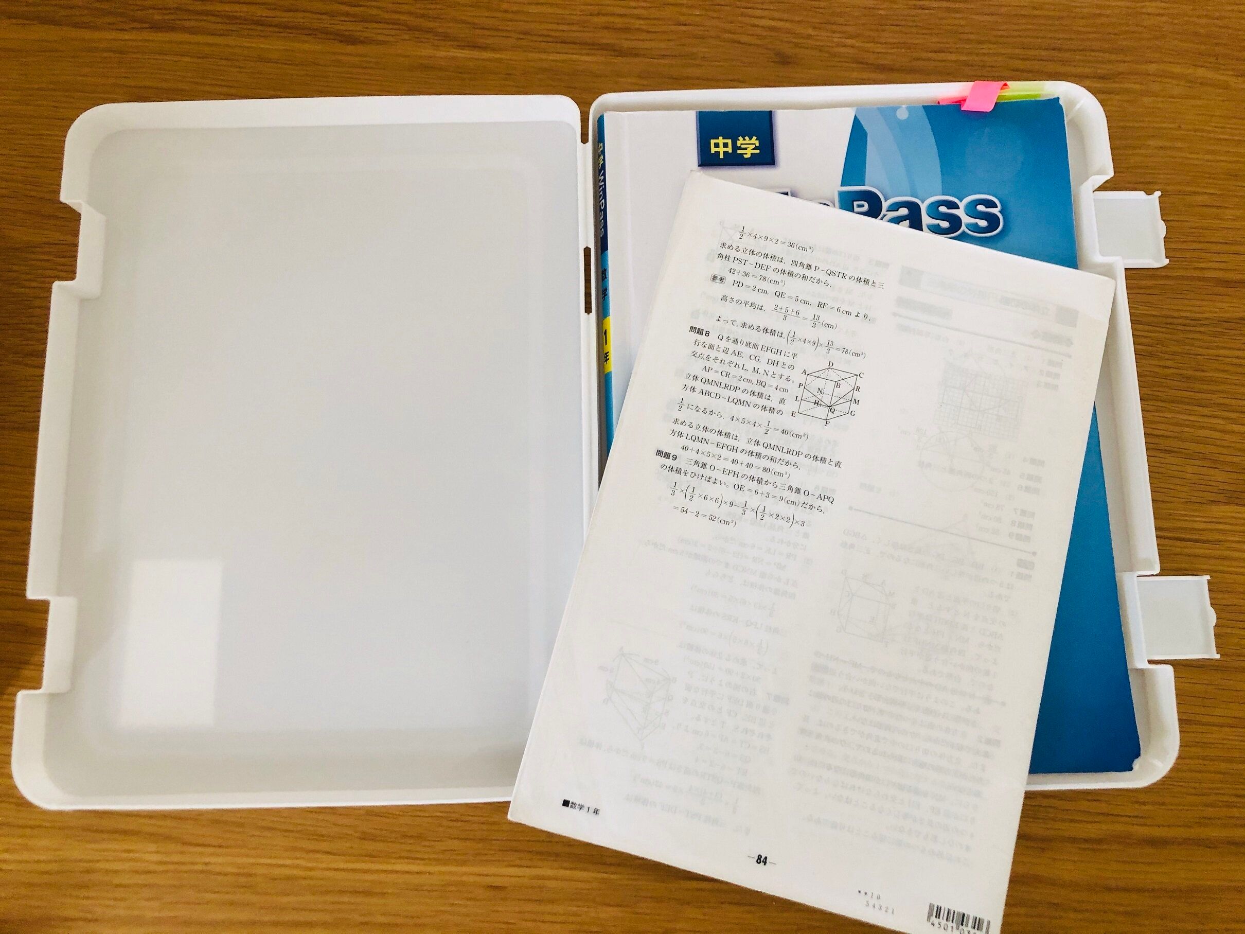 子どものテキストについてきた解答冊子。本棚にそのまま立てると薄くて曲がってしまったり、本棚で迷子になってしまったりしますが、「WIDE A4キャリーケース」を使えばそれも解決。