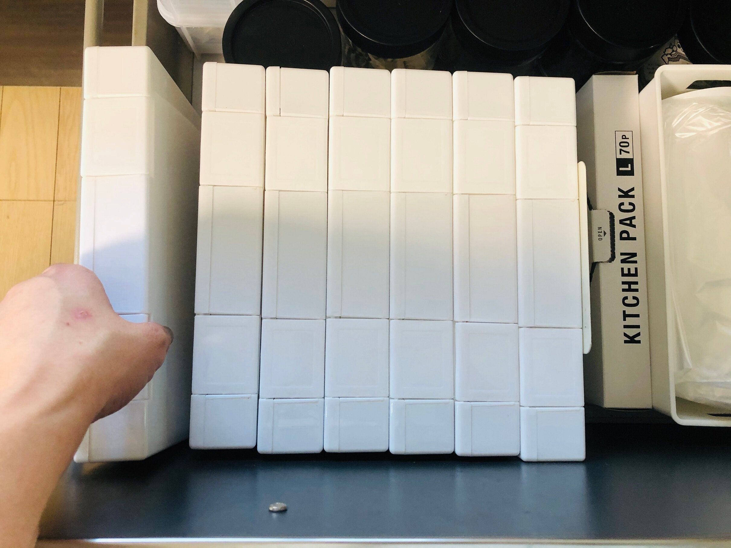 買ってきたままのビニール袋だと粘着部分にくっついてしまったりしてしまうので、袋から出して収納すると、粘着テープを剥がす手間も省けるし、取り出すときにテープにくっついてしまうストレスもなくなります。