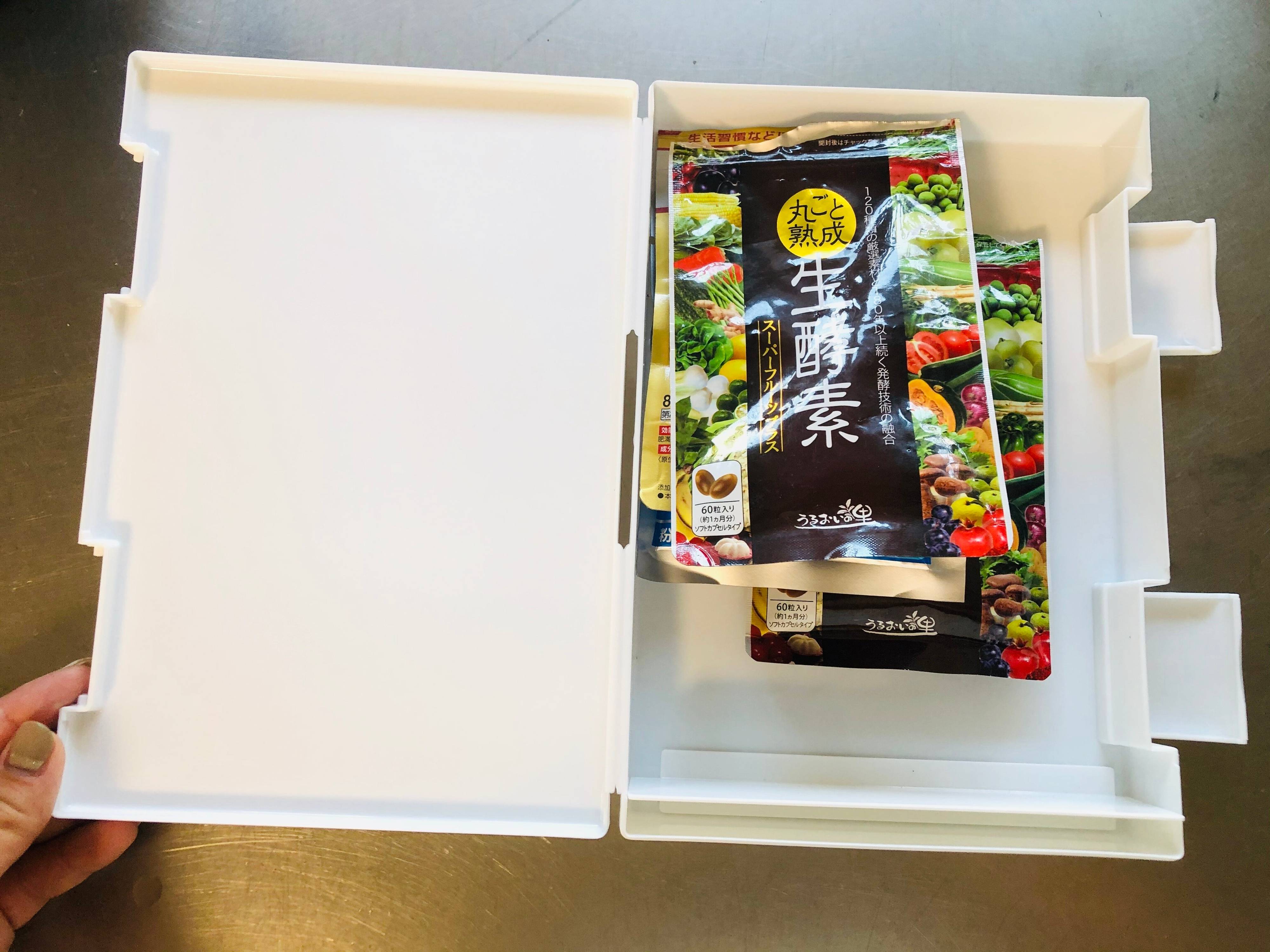 キッチンの一部に立て収納もできちゃいます。かさばりがちなサプリや処方薬も、厚みのある「フリーケースA5」に収納するとスッキリ。使う頻度の多い常備薬は、取り出し易い場所に保管。